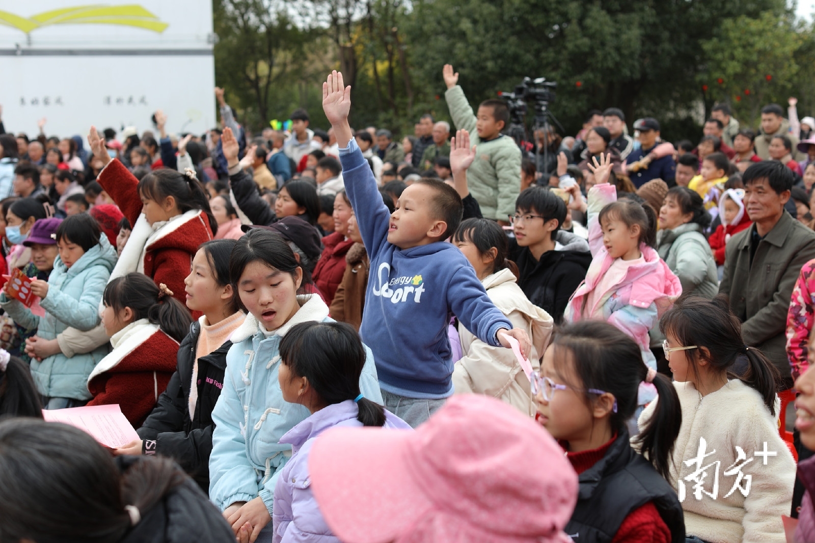 韶关南雄,降温也难挡观众热情,有奖问答环节,观众纷纷举手参与互动。