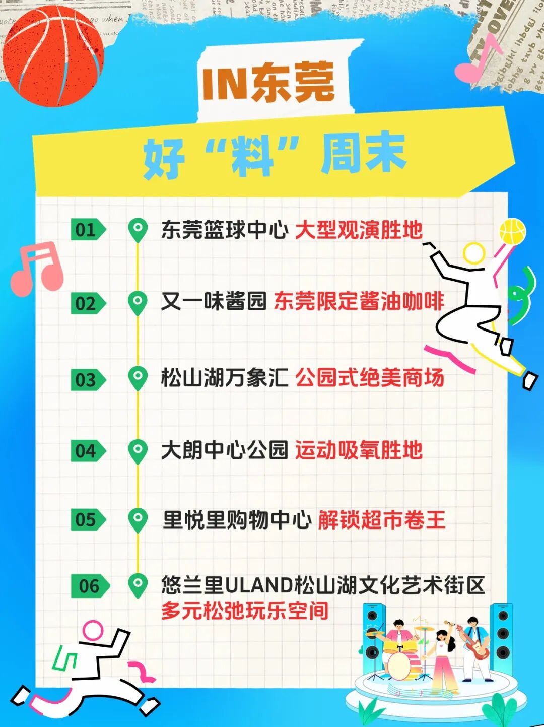 东莞篮球中心(大型观演胜地)——又一味酱园(东莞限定酱油咖啡)——松山湖万象汇(公园式绝美商场)——大朗中心公园(运动吸氧胜地)——里悦里购物中心(解锁超市卷王)——悠兰里ULAND-松山湖文化艺术街区(多元松弛玩乐空间)