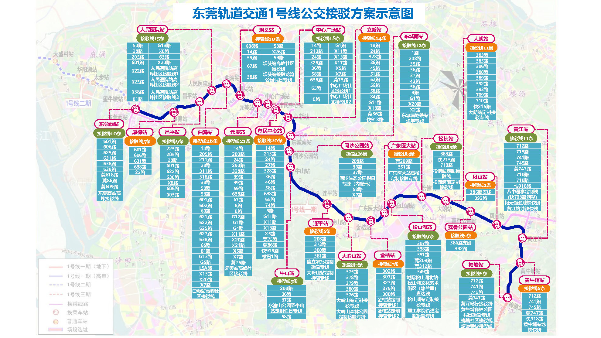东莞轨道交通1号线公交接驳示意图。可点击放大查看