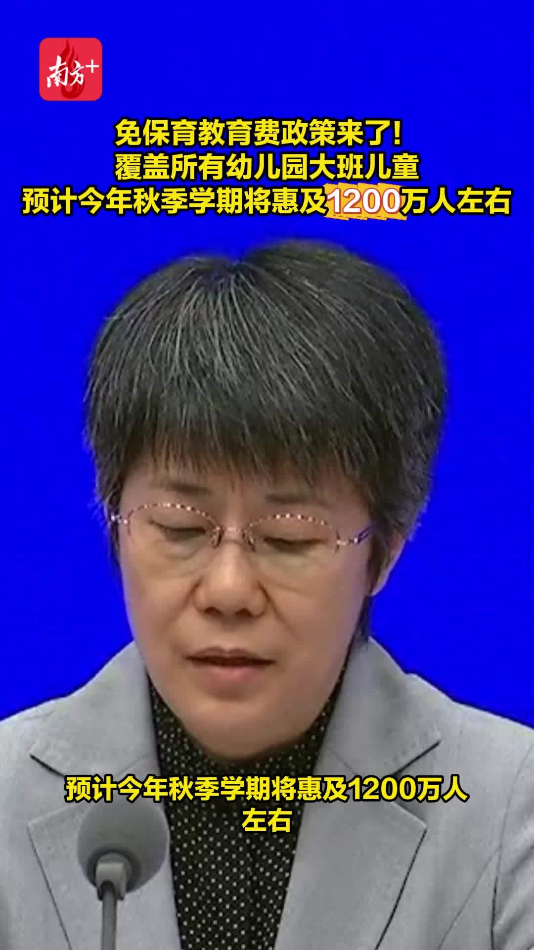 8月7日国新办举行的国务院政策例行吹风会,财政部副部长郭婷婷在会上表示,国家统一实施的免保育教育费政策覆盖所有幼儿园大班儿童,预计今年秋季学期将惠及约1200万人。
