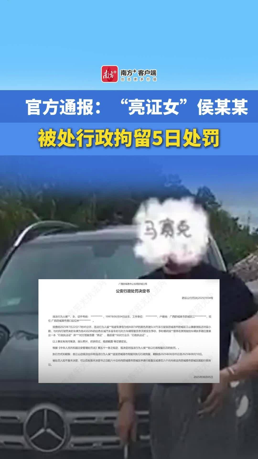 8月6日,记者从广西警方获悉,防城港“亮证女”侯某某因违反《治安管理处罚法》被处以行政拘留五日的处罚。详情>>