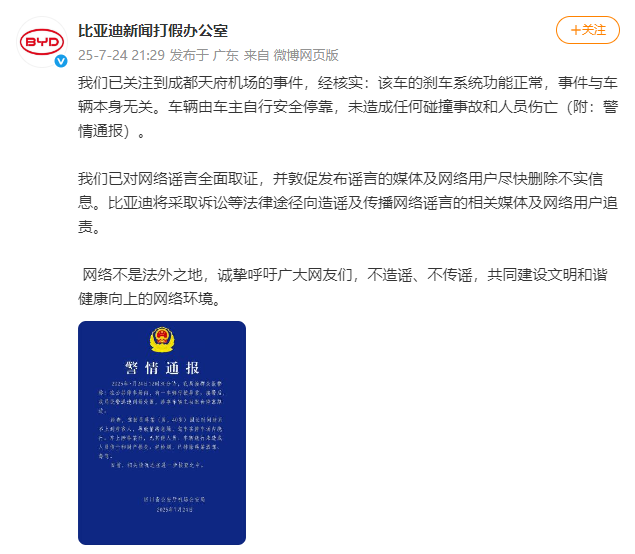 7月24日,在社交平台上广泛传播着一段疑似比亚迪汽车失控的视频。针对上述情况,四川机场公安发布警情通报。