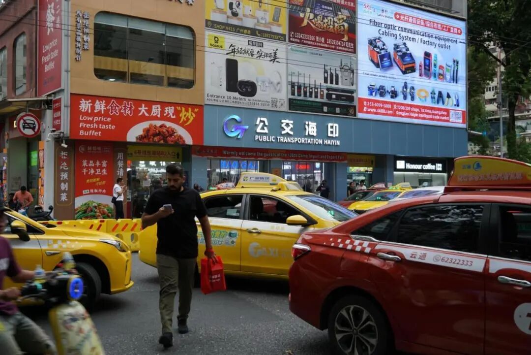 交易市场外,还有不少陆续停下的出租车,搭载着外国客商由广交会抵达此处,准备开启他们的“淘宝”之行。
