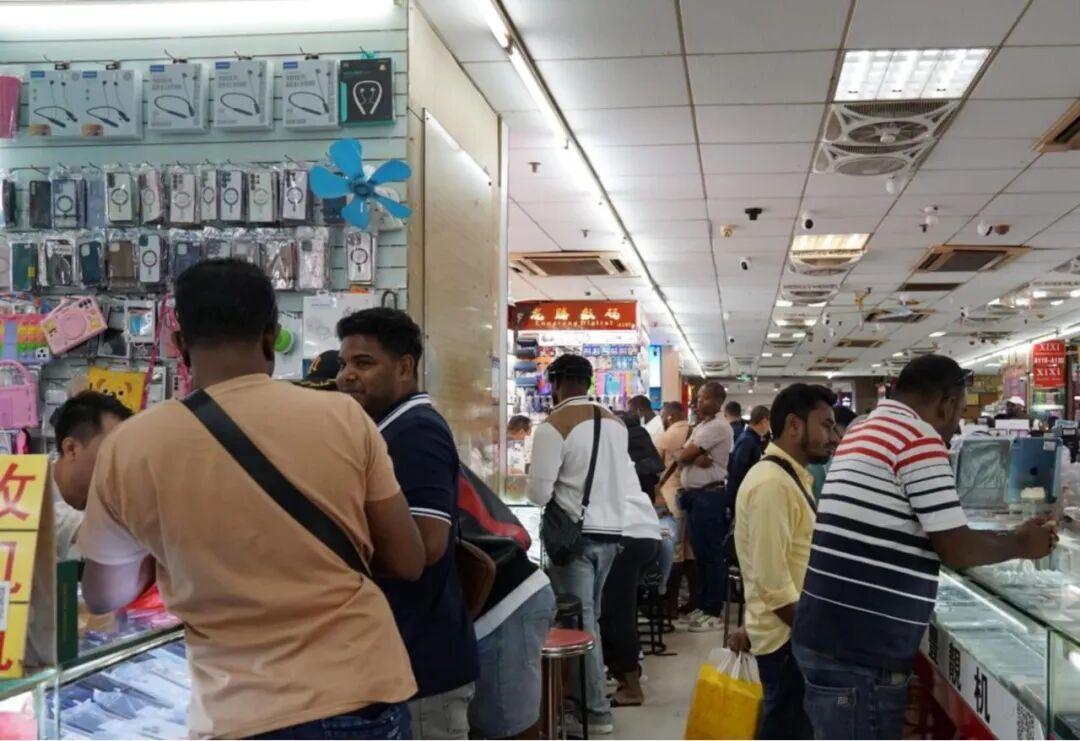 10月21日下午3时许,正值第138届广交会第一期展览结束、第二期尚未开展,广州公交海印国际IT科技城(以下简称“公交海印”)内熙熙攘攘、人头攒动。商铺里正在熟练地跟老板问货、砍价的并非中国面孔,而是来自非洲、中东、东南亚等地的客商。有人拎着硕大的黑色塑料袋,有人拉着行李箱,也有不少顾客背着双肩包精简出行。