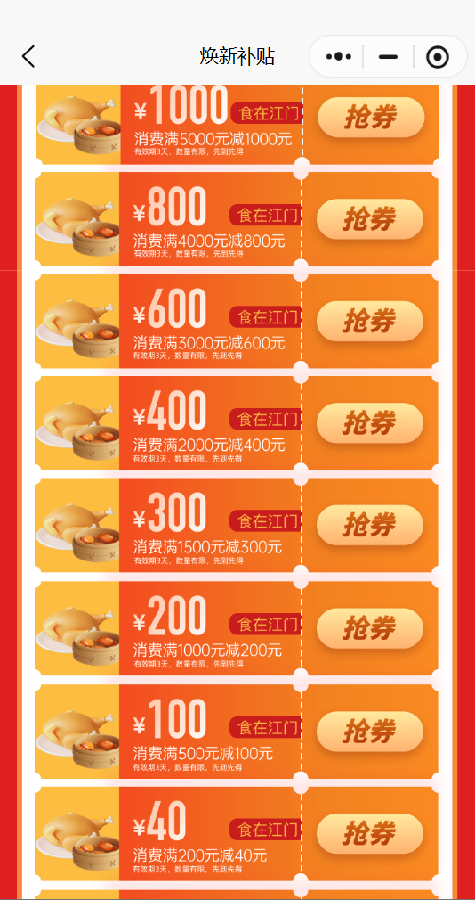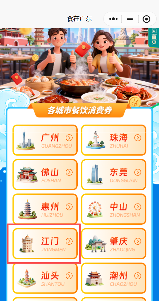 3.点击首页“粤享暖冬”入口,选择“食在广东”进入城市餐饮消费券页面后,点击“食在江门”即可进入活动页面领取消费券。