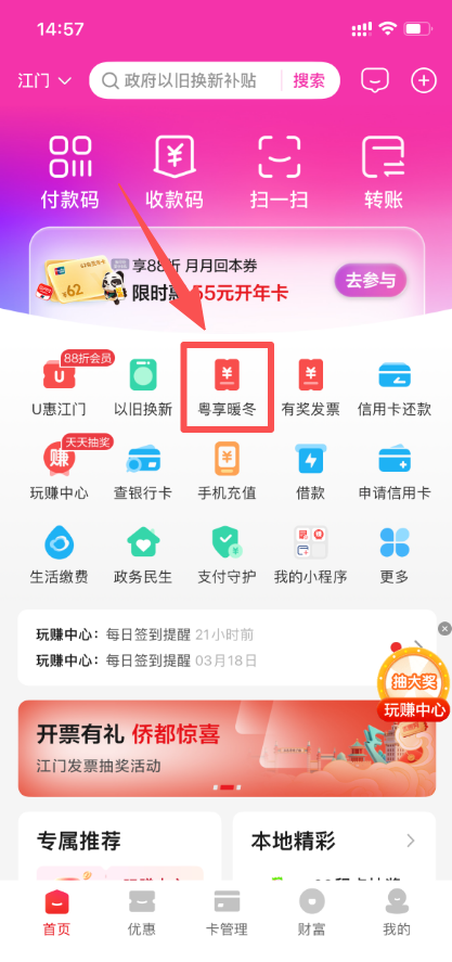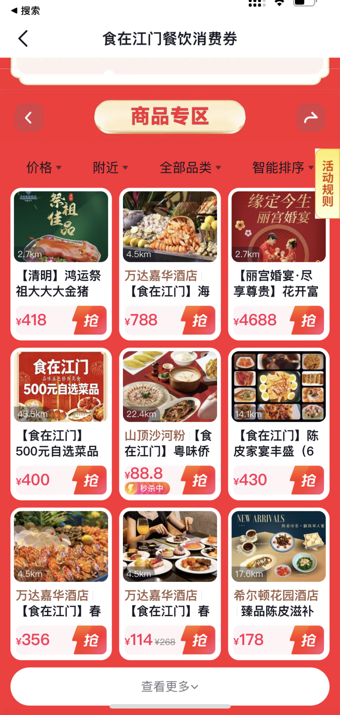 3.在首页搜索栏搜索“江门消费券”或“食在江门”进入活动页面领取消费券。
