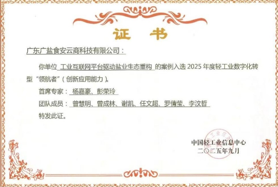 ▲广盐食安云商2025年度轻工业数字化转型“领航者”(创新应用能力)证书