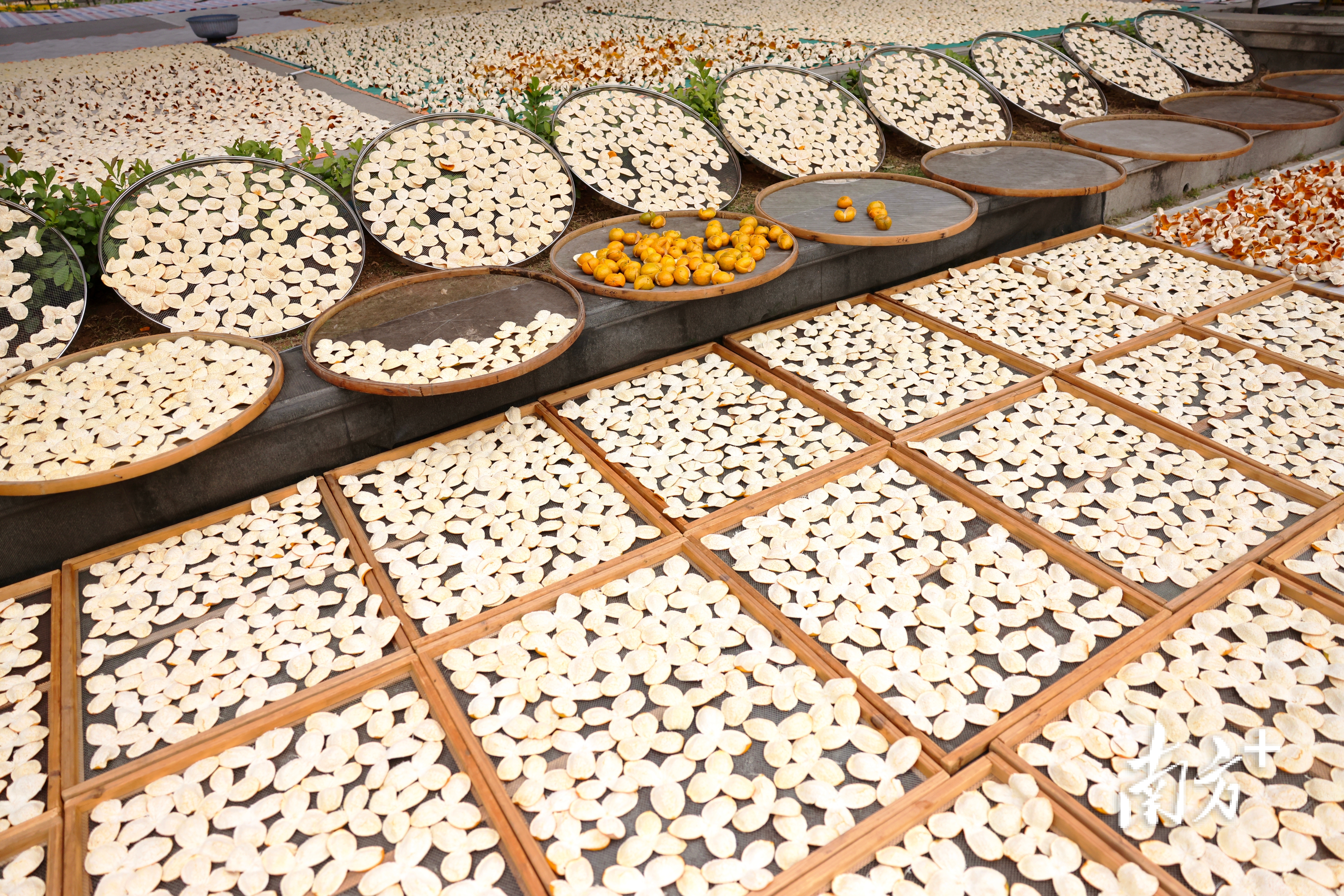 信任危机之下,为何陈皮厂商对于新会的果皮更加青睐,在新会的一间陈皮生产车间内记者找到了答案。夜里七点,爱融匠心绿色生态农业(江门)有限公司工厂内依旧灯火通明,车间内的工人们马不停蹄,刚刚采摘来的茶枝柑果,在工人手中一压一起,果皮分离。而果皮则被运往下一道工序,心灵手巧的大姐将圆滚滚的果皮一顶一翻,鲜果皮如三叶花瓣样被展开铺平,一片片整齐排列在网格之上。随后,这些果皮会被送入风干车间,经过十余个小时的风干后,陈皮初步的样子有了。