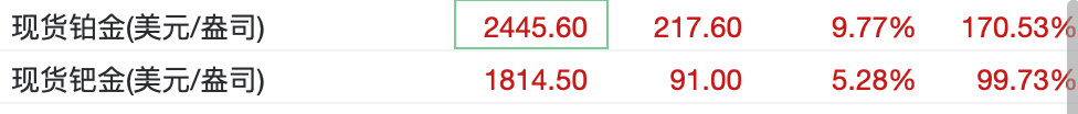 国际现货铂金同步走强,截至发稿涨近10%,价格飙升至2445.6美元/盎司,刷新历史新高,内外盘联动明显。