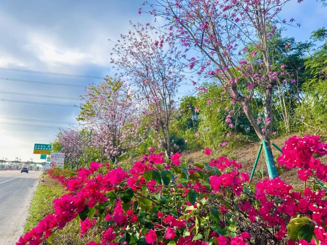 美丽多姿的三角梅在阳光下绽放,生机勃勃的绿色植物群落热烈欢迎过路旅客……1月的广东高速公路摇身一变,沿线一片绿意盎然,让旅客沉浸式邂逅岭南绿美风韵。