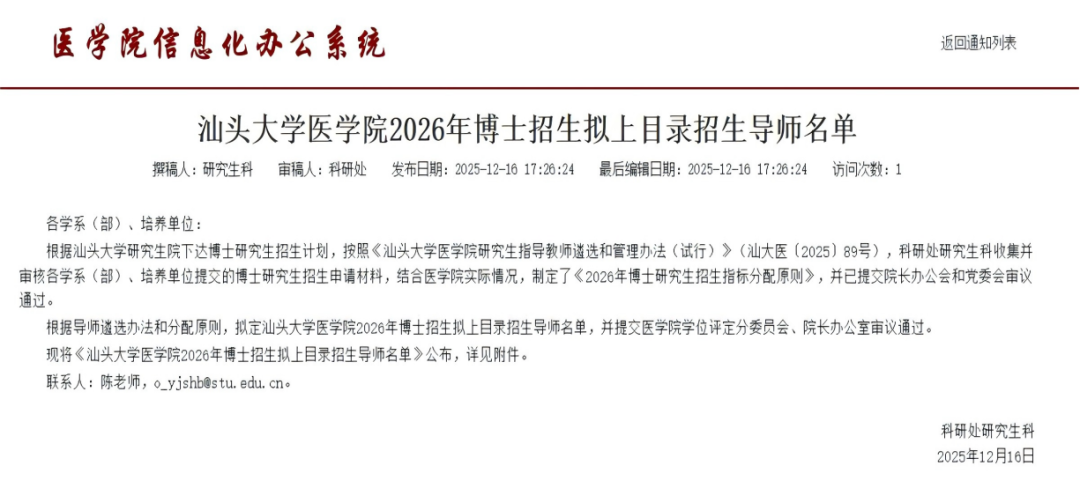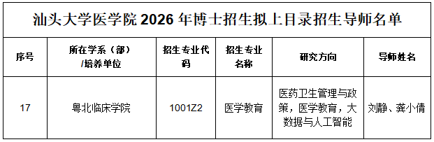 1. 汕头大学2026年博士研究生招生简章已公布(网址为https://www.gs.stu.edu.cn/yjszs/doctor_zsjz.htm),查看我院对应招生专业目录、考试与录取要求。
