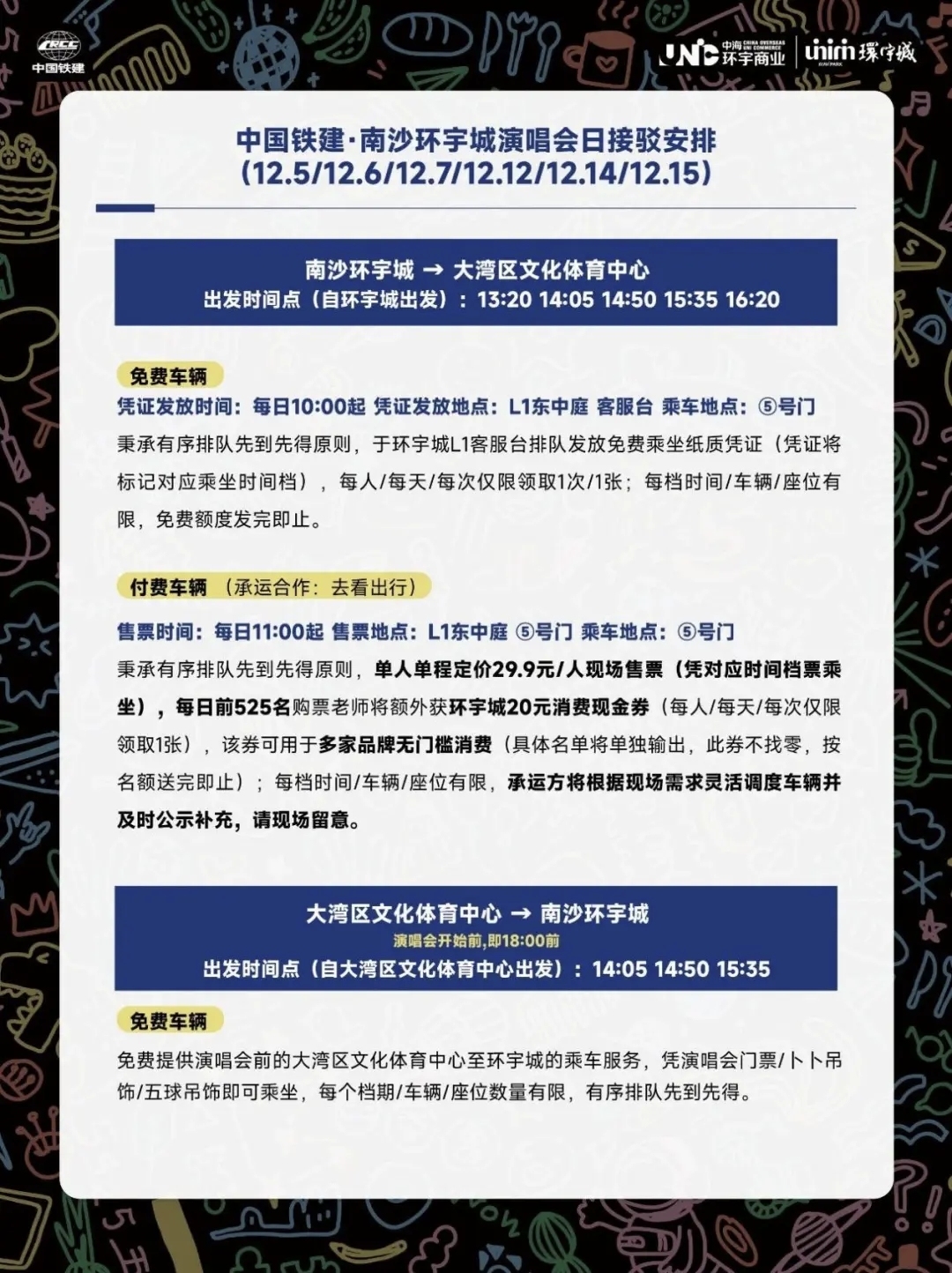 为了方便歌迷观看演唱会的同时打卡MAYDAYLAND广州站,中国铁建·南沙环宇城也正式发布接驳车指引,宣布五月天演唱会期间将有往返MAYDAYLAND与大湾区体育场的接驳车,粉丝凭票或周边吊饰即可免费乘坐,座位有限先到先得。