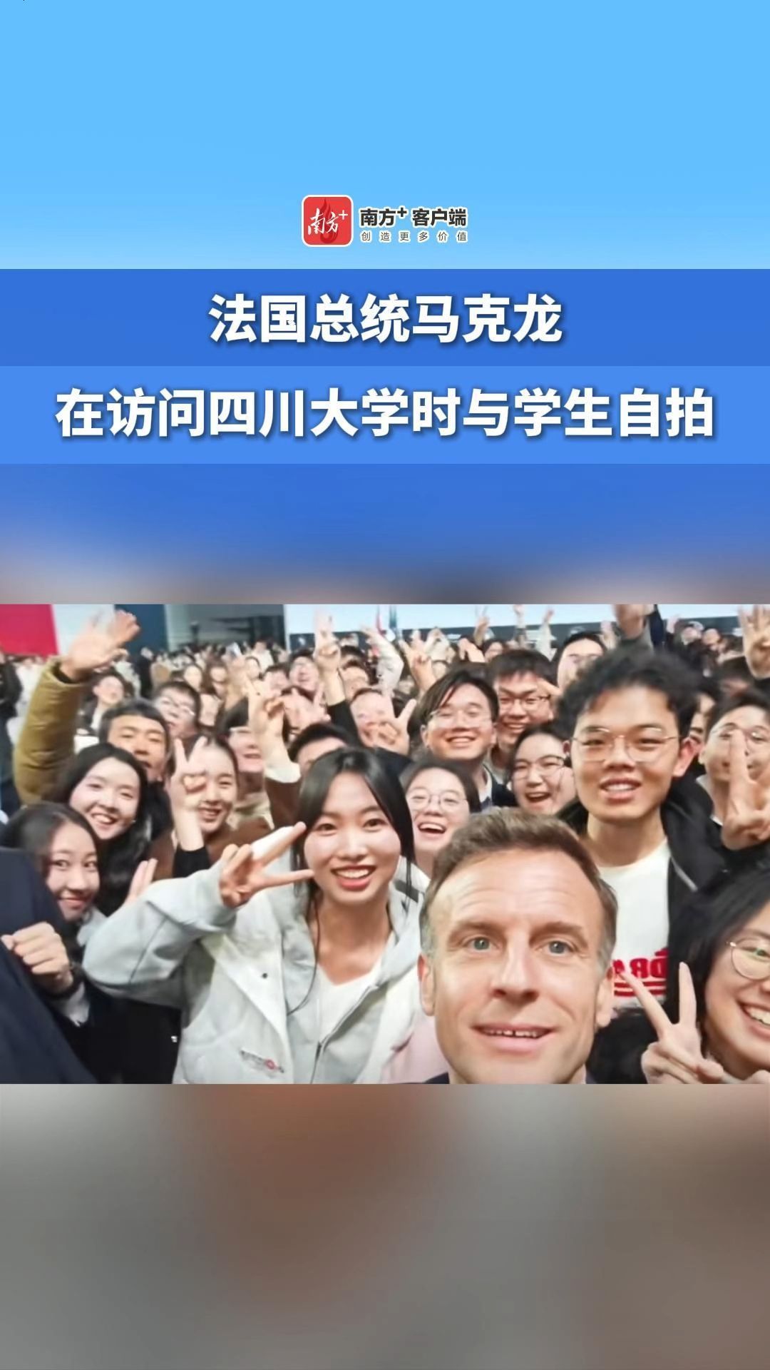法国总统马克龙在访问四川大学时与学生自拍