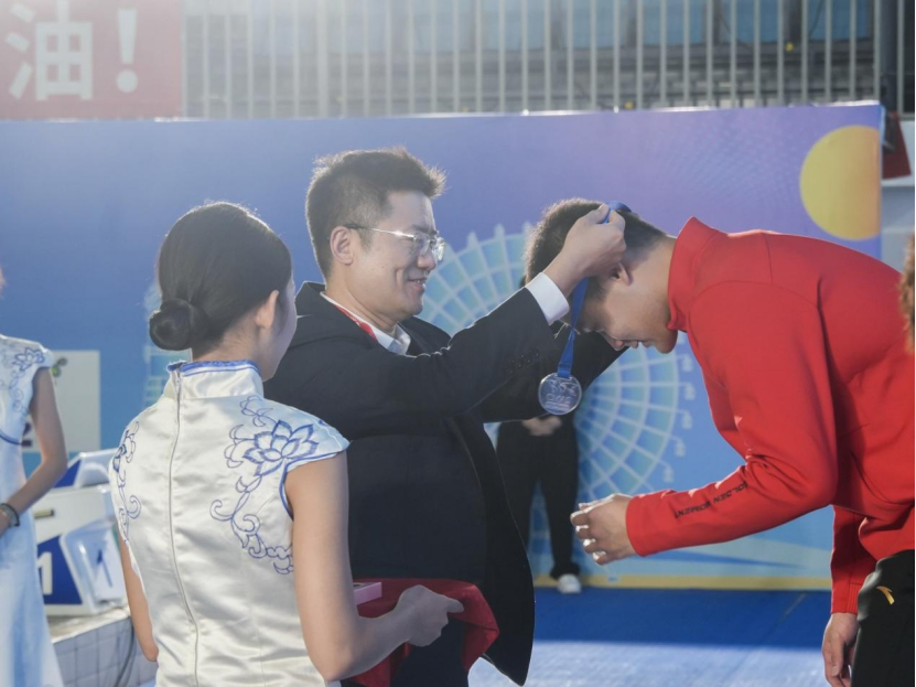 作为赛事主赞助商,中国工商银行全程助力这场国际级潜水盛宴,现场“中国工商银行为运动健儿加油”的标语醒目亮眼,传递出对参赛选手的真挚期许与强劲支持。本次大赛来自东、西亚多个国家和地区的运动员展开激烈角逐,陈光远作为重要嘉宾亲临现场,观摩赛事进程,见证选手们的高光时刻,并与世界潜水联合会运动委员会主席米歇尔・古纳德亲切交流。