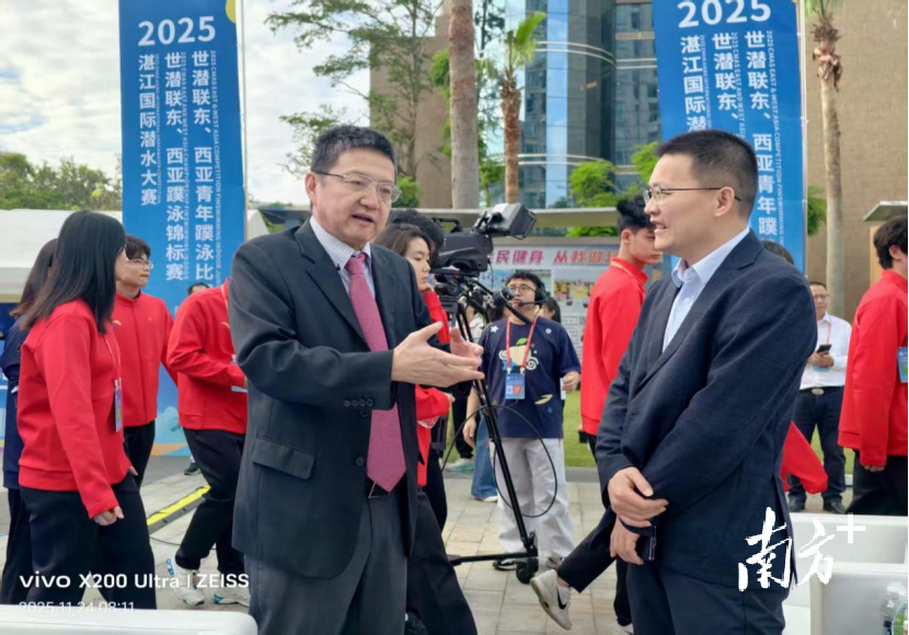 活动现场,管小军与国家体育总局湛江潜水运动学校校长亲切交谈。