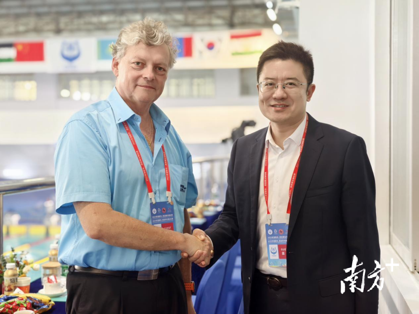 陈光远与世界潜水联合会运动委员会主席米歇尔・古纳德亲切交流。