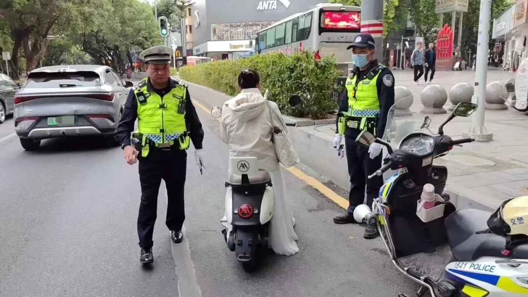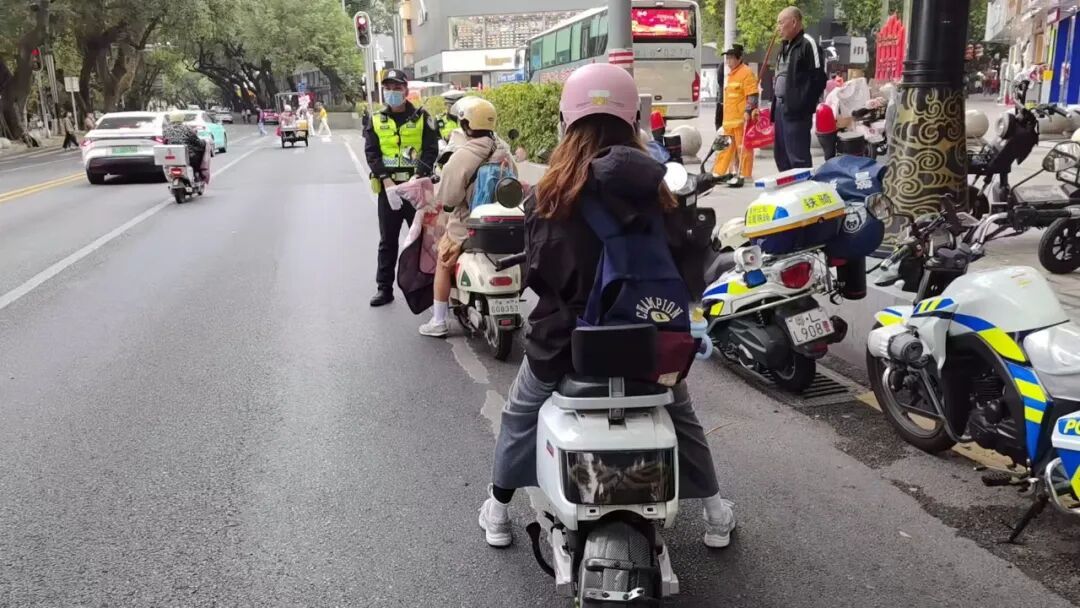 执勤民警对过往摩托车、电动自行车进行严格检查,重点查处无牌无证、不佩戴安全头盔、违规载人、闯红灯、逆行等违法行为。对存在交通轻微违法的“摩电”驾乘人员,民警坚持以“教育为主,处罚为辅”的执法理念,通过播放典型事故案例、派发宣传单张等方式,开展面对面宣传教育。