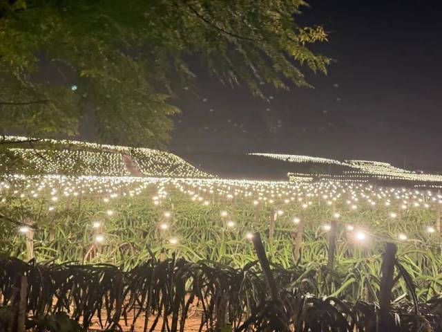 广西的火龙果灯海又火了!如梦似幻的点点灯光照亮旷野,一片宏大的灯光秀场之下,火龙果默默地开花结果。火龙果咋这么好骗,给点灯光就能促进生产?@果壳