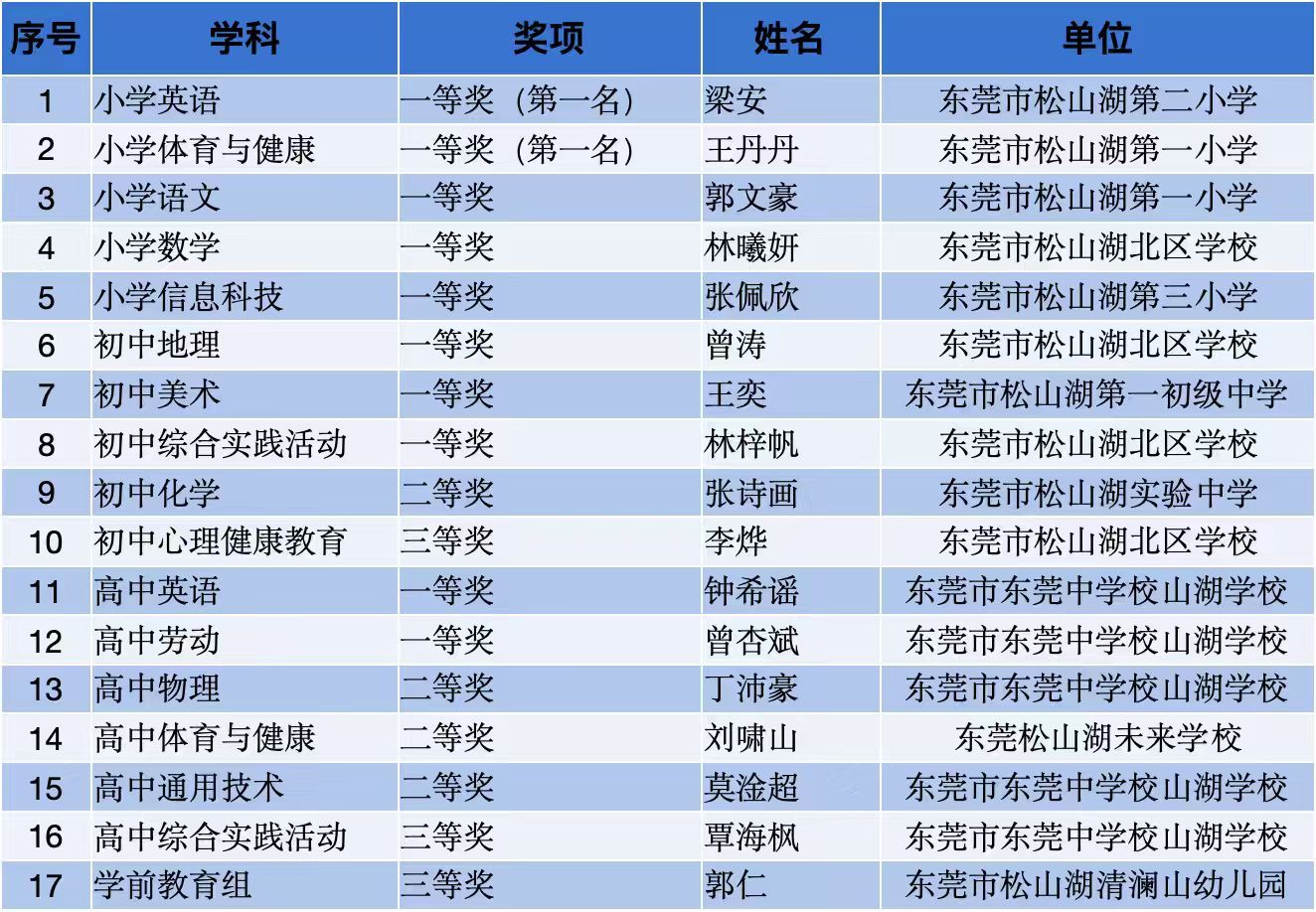 纵观本届赛事,松山湖的17位老师从东莞市赛中脱颖而出,成为各个学科中唯一代表东莞出征的教师,成绩斐然。梁安、张诗画、钟希谣、周乐瑶四位老师更是在东莞市教学能力大赛总决赛小、初、高及班主任组中成功问鼎,拟被授予东莞市五一劳动奖章。
