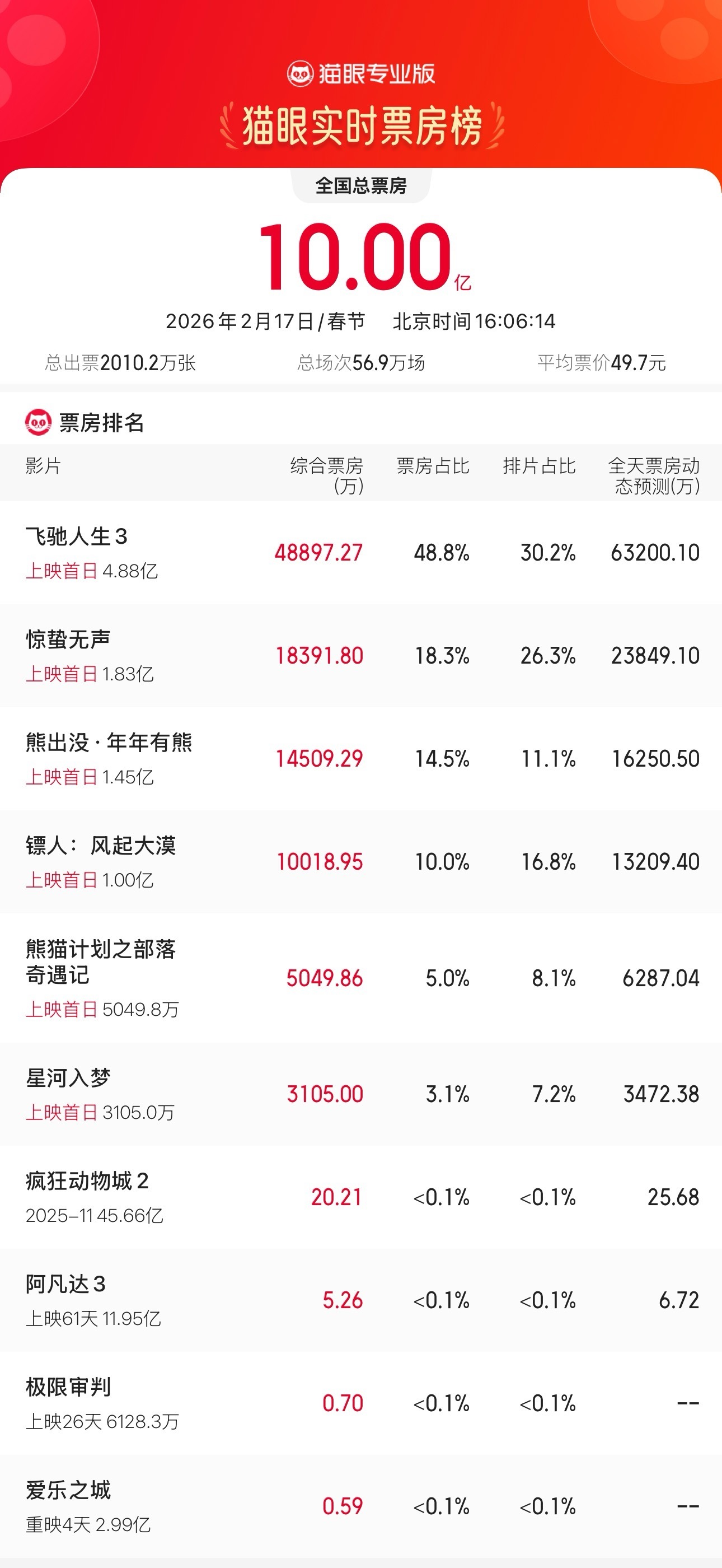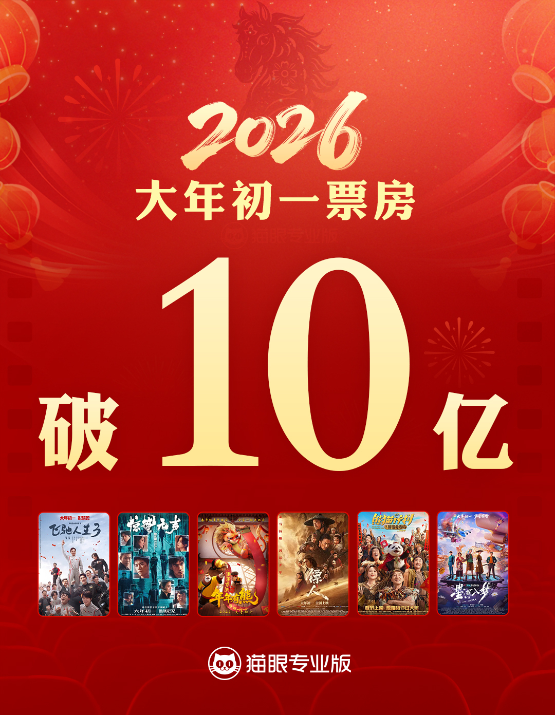 据猫眼专业版数据,2026年大年初一总票房突破10亿元。《飞驰人生3》大年初一登顶全国票房榜,《惊蛰无声》《熊出没·年年有熊》分列二三位。南方+记者 张思毅 南方日报、南方+客户端原创,未经授权不得转载 编辑 冯颖妍 李杰伦校对 蒙骏鸿 订阅后可查看全文(剩余80%)