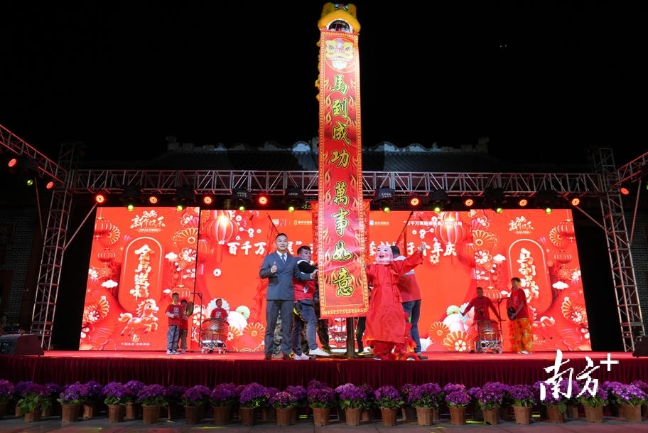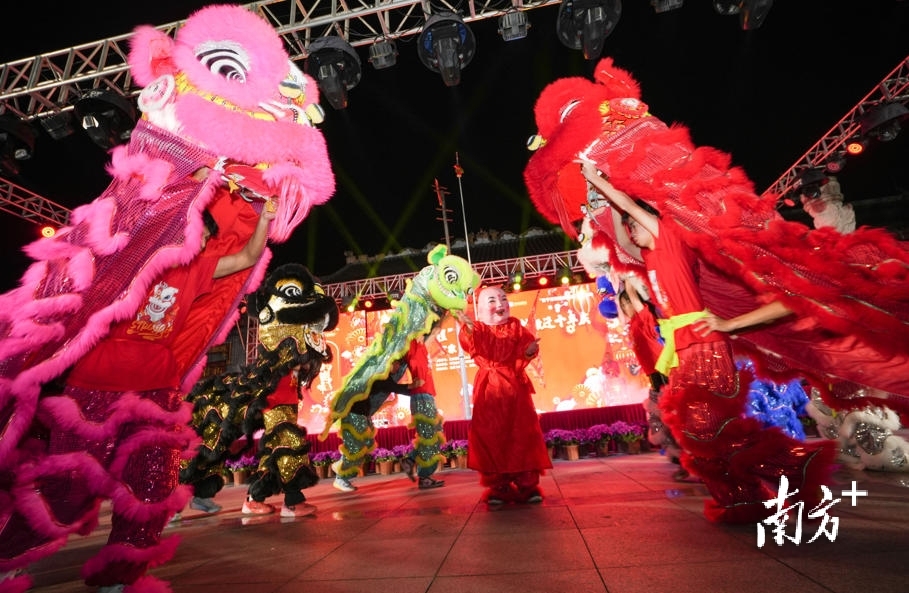 一阵铿锵的锣鼓声划破广场的喧闹,小小舞狮队的孩子们穿着彩色表演功服,正在广场外热场迎宾。这是村委组织青少年组建的舞狮队,还将在百家宴上做开场表演,10岁的小队员卢艺刚卸下狮头,额头渗着汗珠却眼神发亮:“练了快一年舞狮,就想在今晚好好表演,祝大家新春快乐!”舞狮队负责人、村干部邝剑锋站在一旁感慨道,如今村里的文化生活越来越丰富,“村BA”篮球赛、“村晚”、送戏下乡已成常态,舞狮团的成立让铿锵锣鼓声重新响起,为乡村注入了传承活力,“让孩子们既可以锻炼身体又能传承非遗,精气神儿越来越足。”