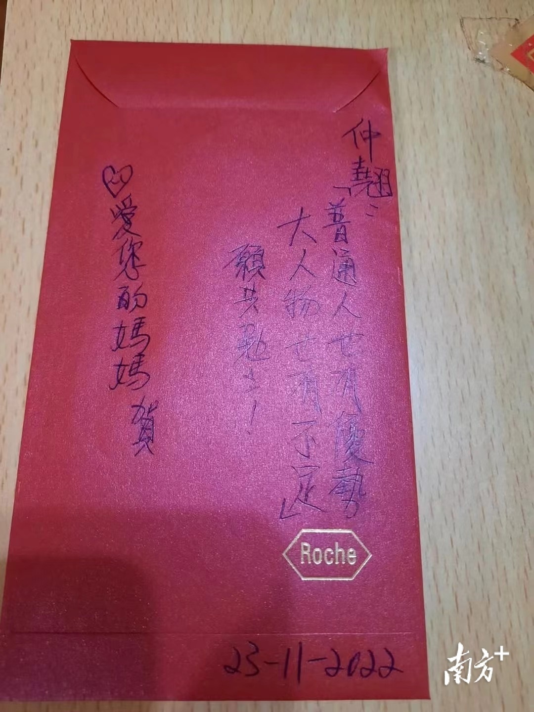 这句独一无二的祝福语,写在了莫妈妈给儿子准备的纸质红包背面。每年生日,莫妈妈都会在红包上手写不同的祝福语,并亲手送给莫仲翘。这三年,虽然因疫情未能见面,但莫妈妈仍保持着这个传统。只不过,红包暂时由莫妈妈代为保管,再用手机拍下祝福语发给莫仲翘。
