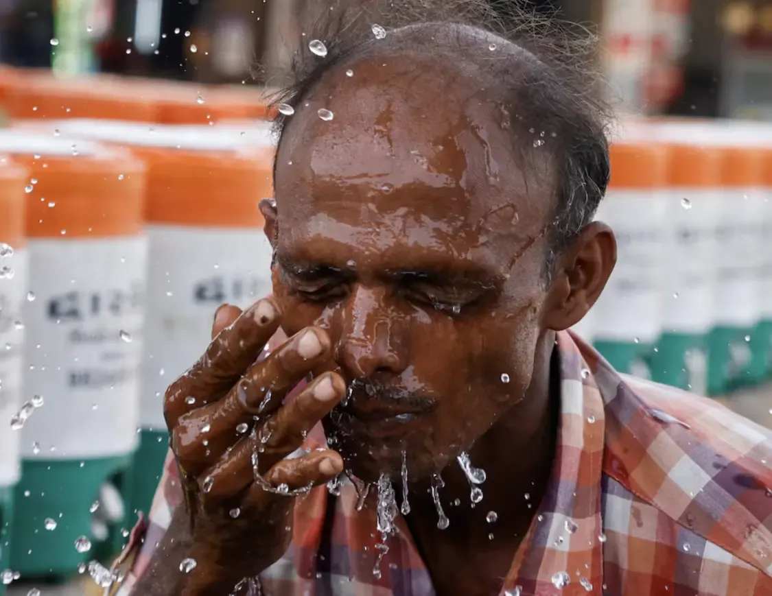 ▲5月29日,印度一名男子为脸部泼水降温