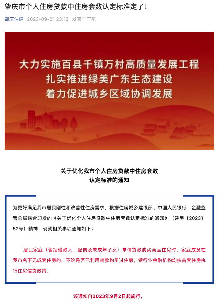 9月1日,肇庆市住房和城乡建设局、中国人民银行肇庆市分行、国家金融监督管理总局肇庆监管分局联合发布《关于优化我市个人住房贷款中住房套数认定标准的通知》,9月2日起实行“认房不认贷”。