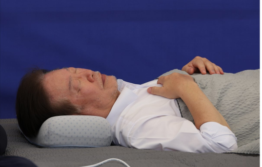 绝食抗议已经进入第九天的韩国最大在野党党首李在明在帐篷内躺下休息。图源:韩媒