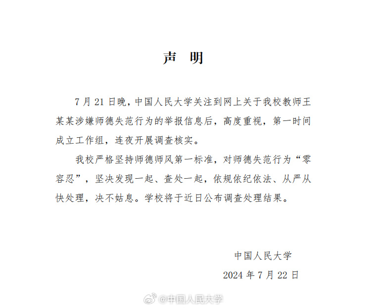 对此,人民大学表示,该校严格坚持师德师风第一标准,对师德失范行为“零容忍”,坚持发现一起、查处一起,依规依纪依法,从严从快处理,绝不姑息。该校将于近日公布调查处理结果。