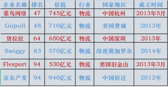 从上表可见,百强独角兽榜单中,就有6家从事物流行业。