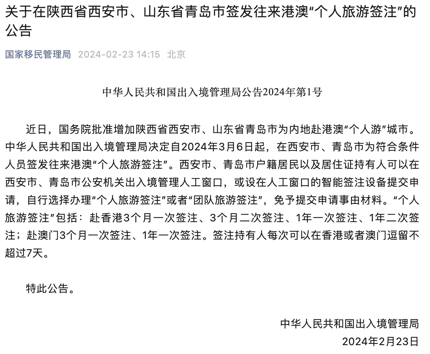 2月23日,中华人民共和国出入境管理局发布2024年第1号公告表示,近日国务院批准增加陕西省西安市、山东省青岛市为内地赴港澳“个人游”城市。