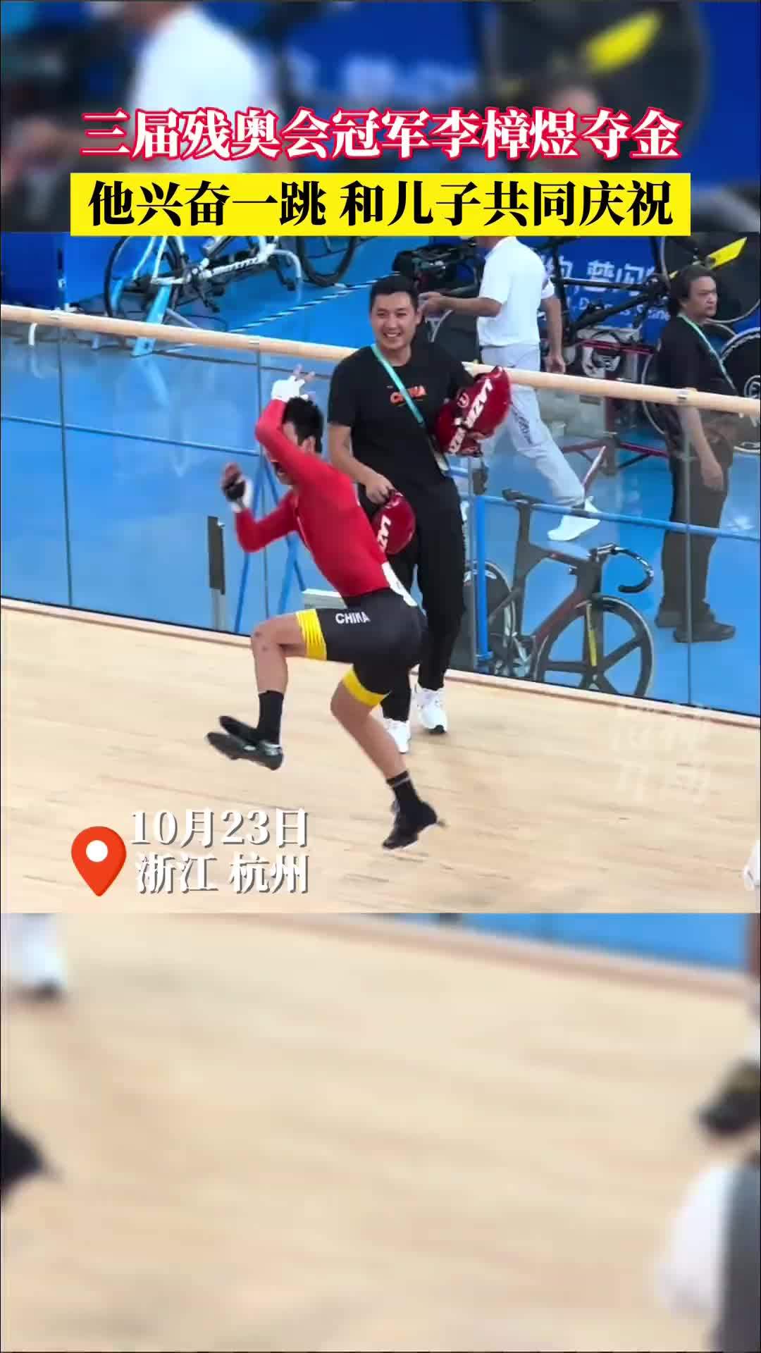 在场地自行车混合团体竞速赛中,由李樟煜等人组成的中国队获得金牌,并打破亚残运会纪录。夺冠后的李樟煜奋力奔向儿子,那一刻,父爱的光比金牌更耀眼。
