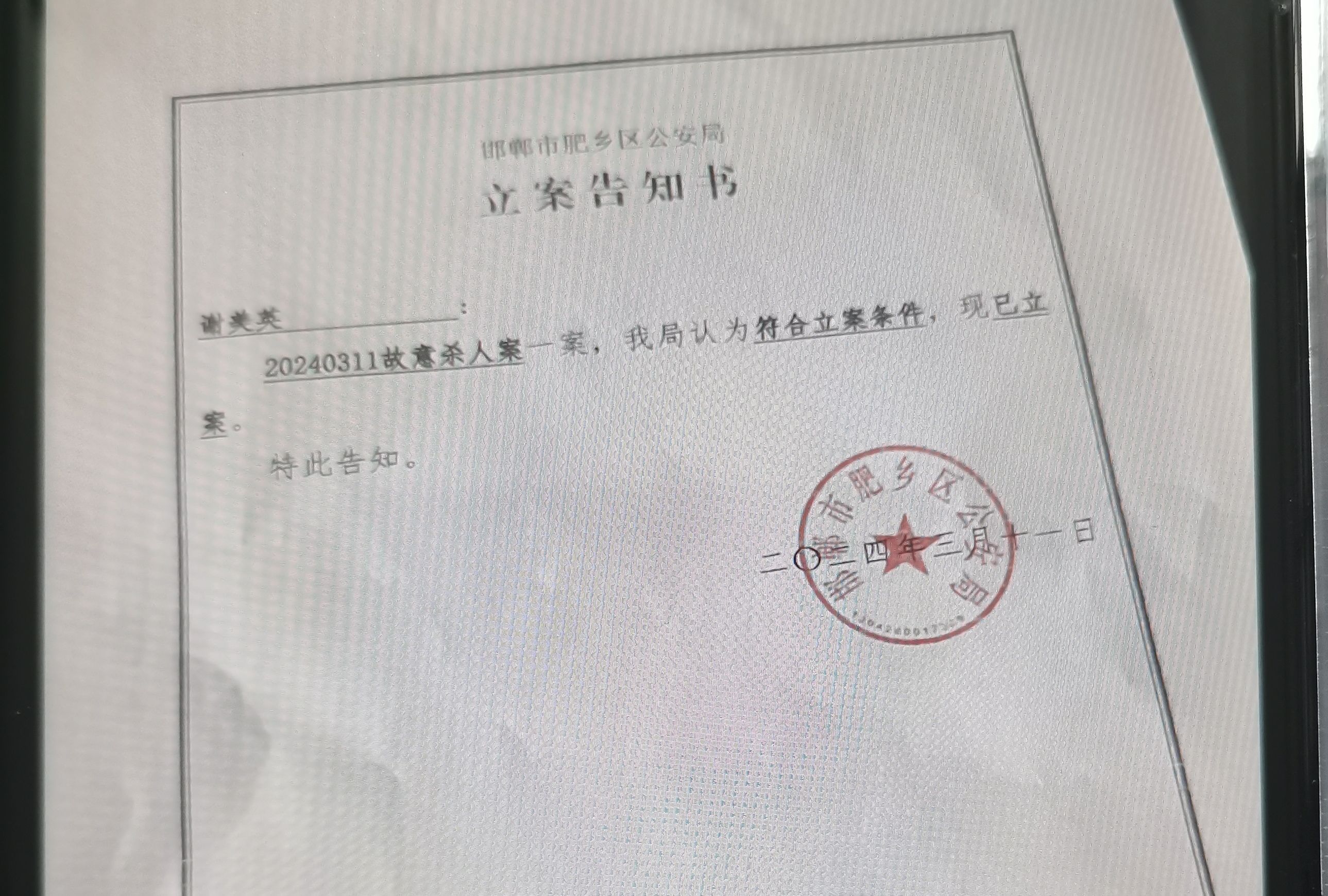 3月11日,王家收到了肥乡区公安局的立案告知书,案由是“故意杀人”。3月15日,新京报记者从邯郸警方了解到,张某等三人因涉嫌故意杀人,已被刑事拘留,目前该案由邯郸市公安局刑侦支队、肥乡区公安局联合侦办,三人的行凶原因仍在调查中。