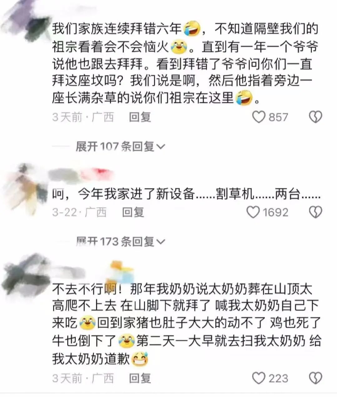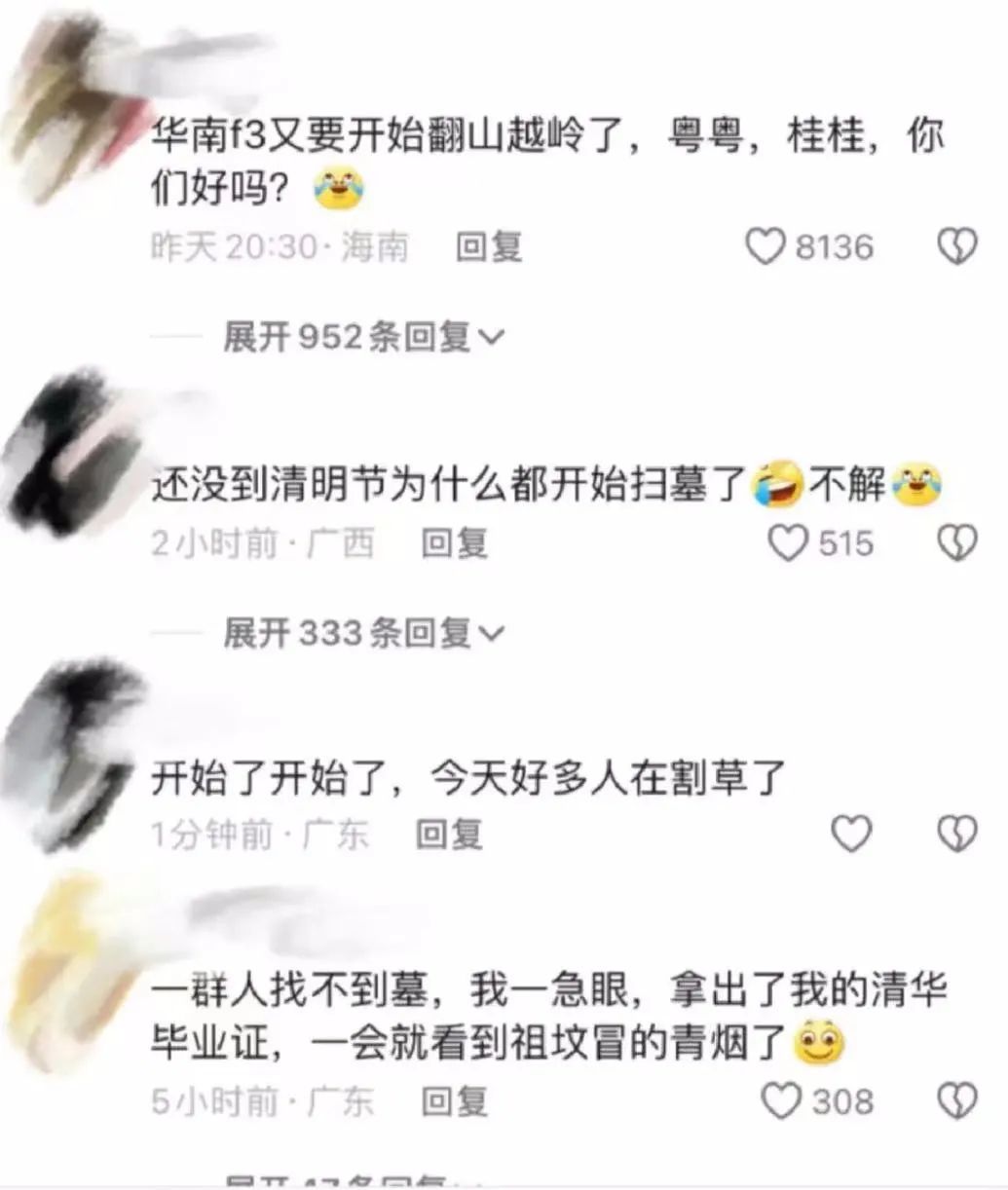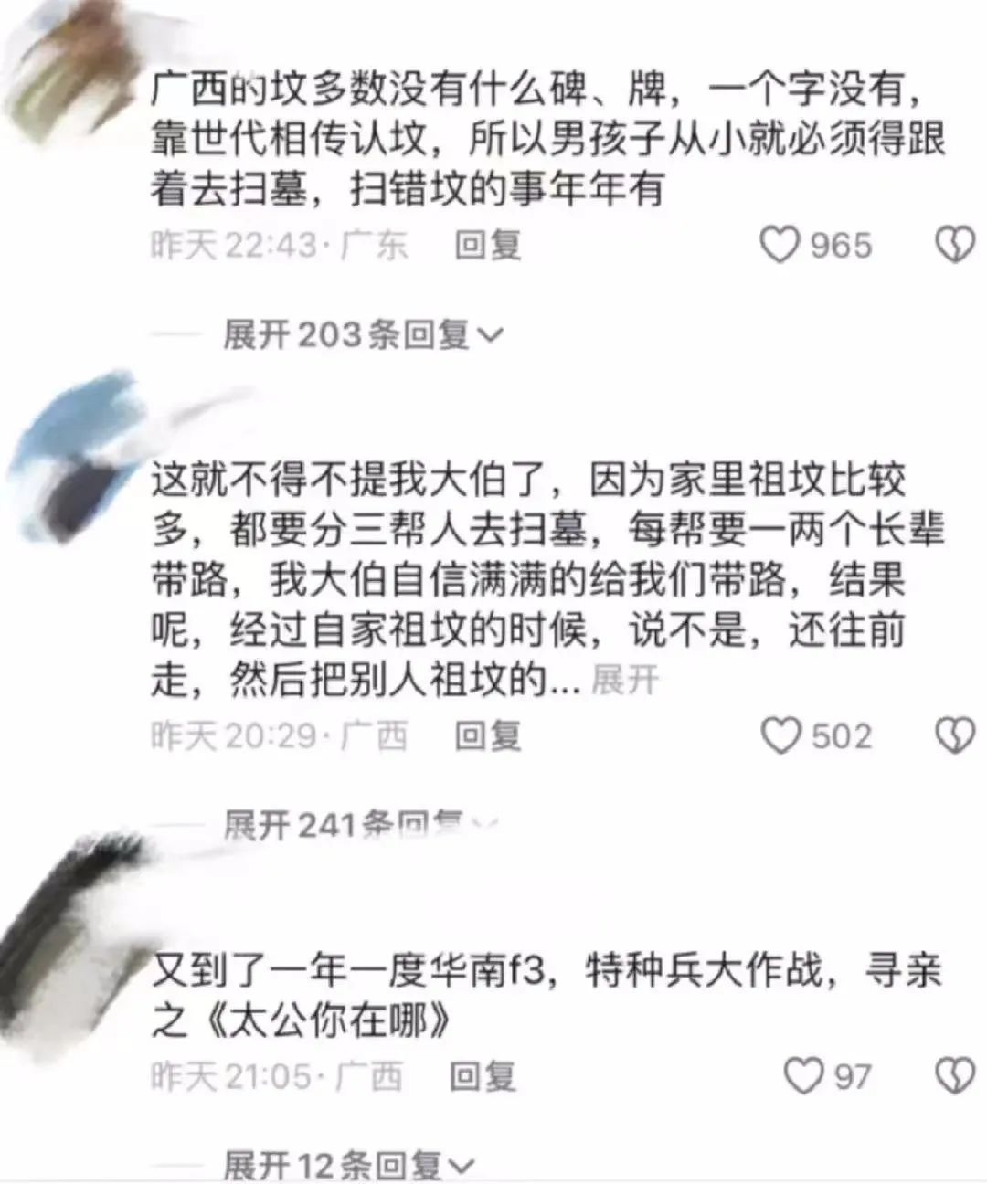 华南F3网友表示“每年上山靠认树,年年都有新的树,年年拜山都迷路。”扫墓路上最多的话可能就是“这边上去的吧”、“我记得前面有棵树的”、“我记得这棵树没有这么大的”。