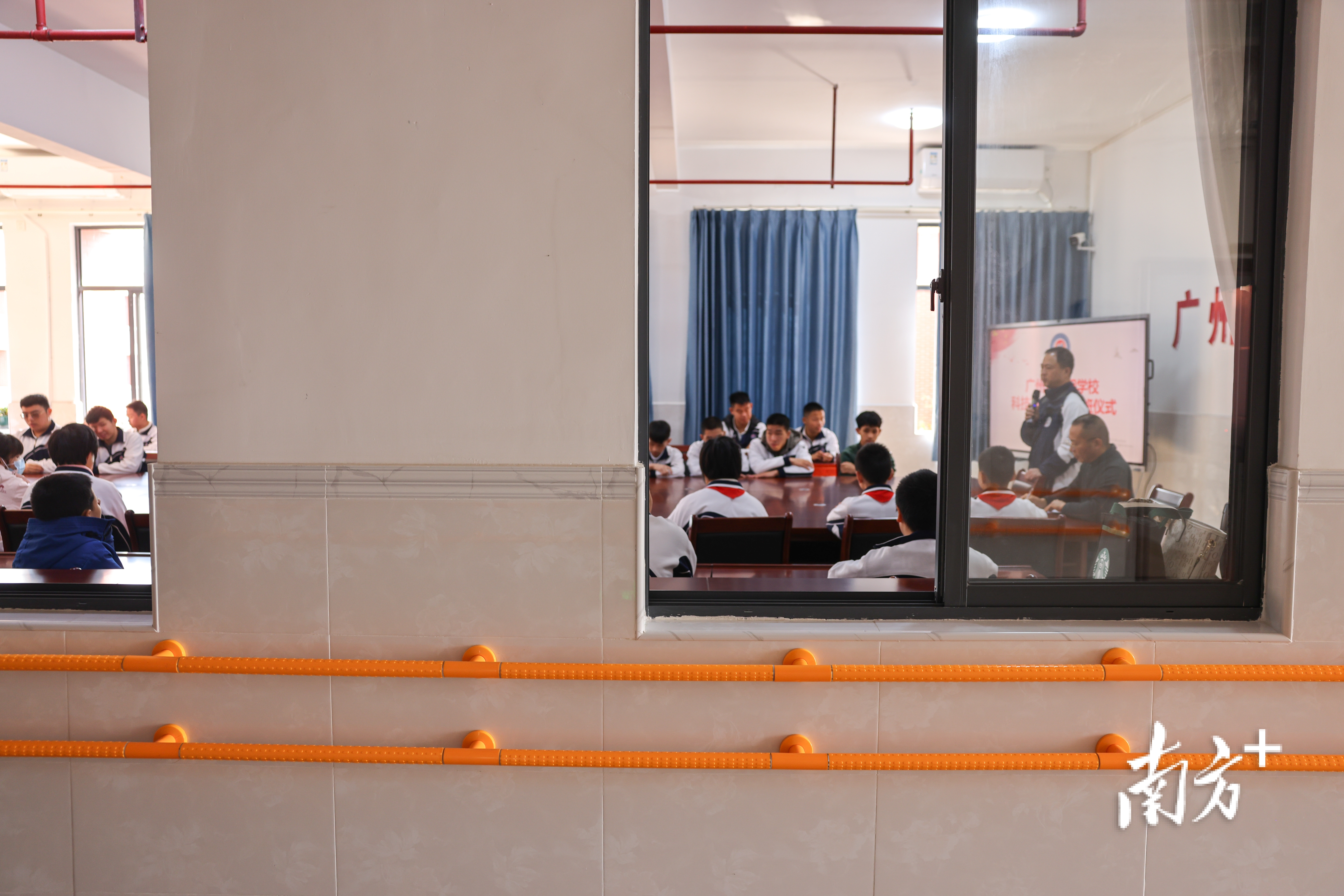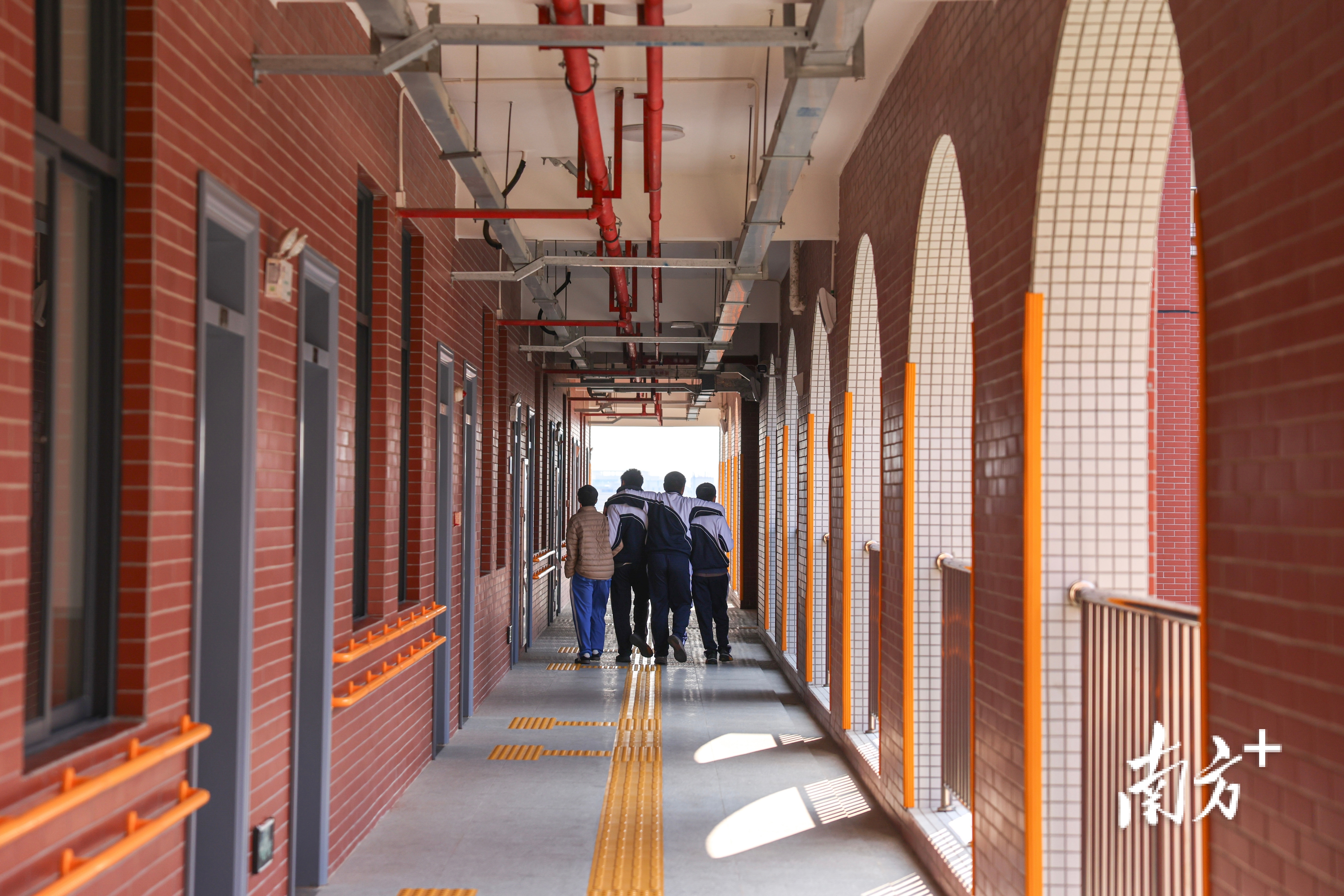 2025年4月1日,广州市启明学校,课间学生们在楼道休息。