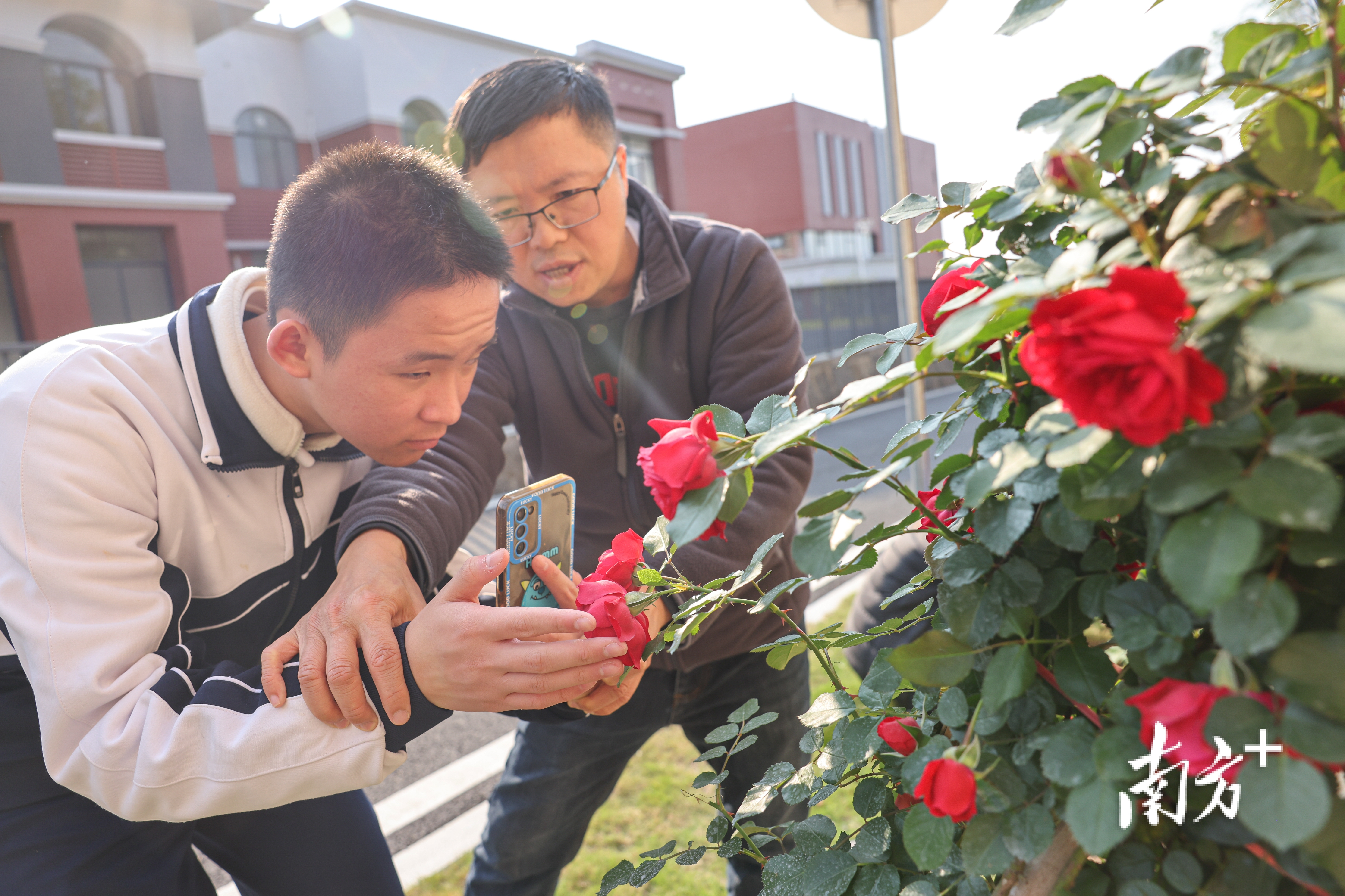 今年广东的春天温暖而明媚,广州市启明学校白云校区的月季花开正艳,非视觉摄影小组的小伙伴们三两成群,拿着手机进行拍摄。
