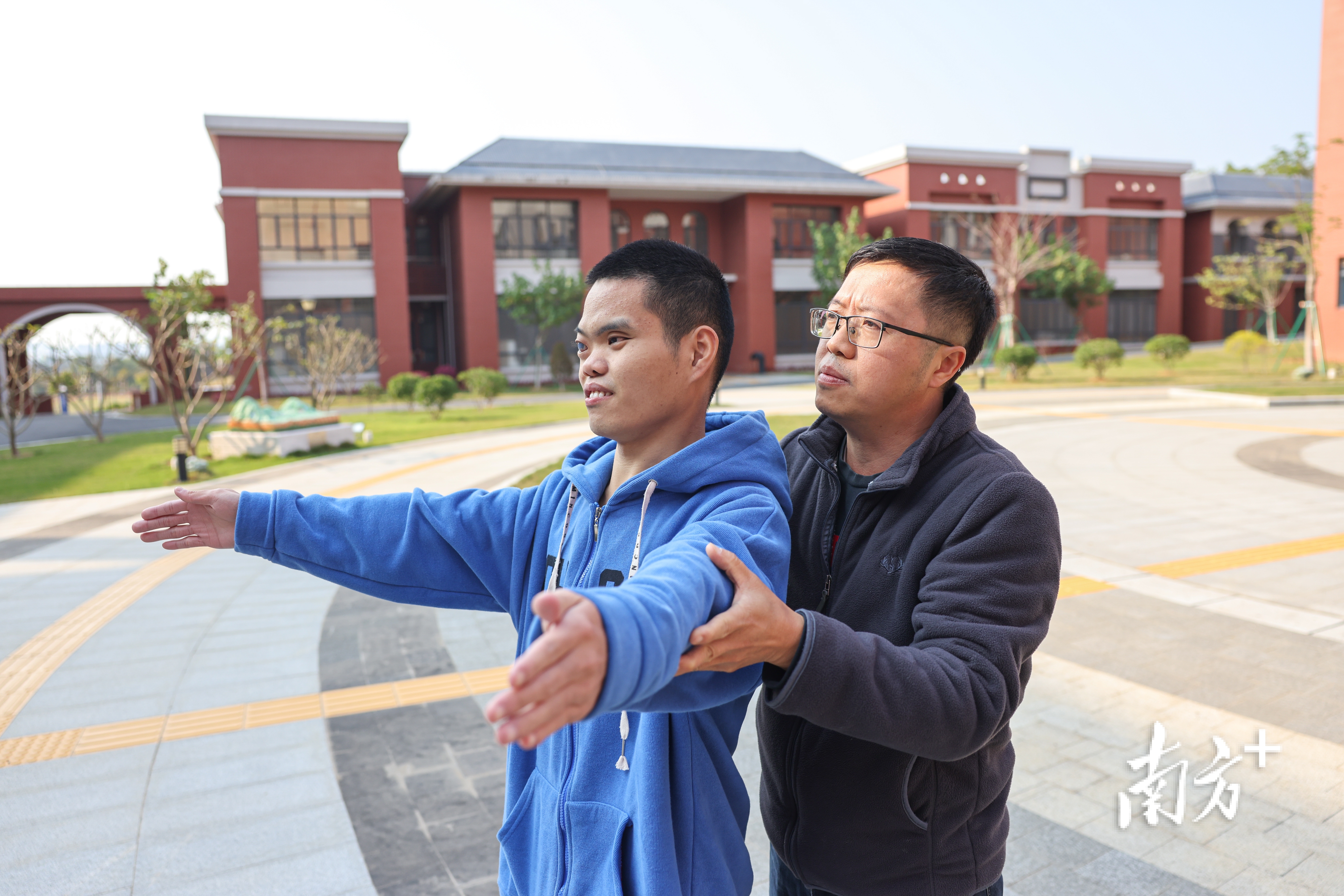 2025年4月1日,广州市启明学校,非视觉摄影小组的摄影老师吴宇新在教同学们拍合照。
