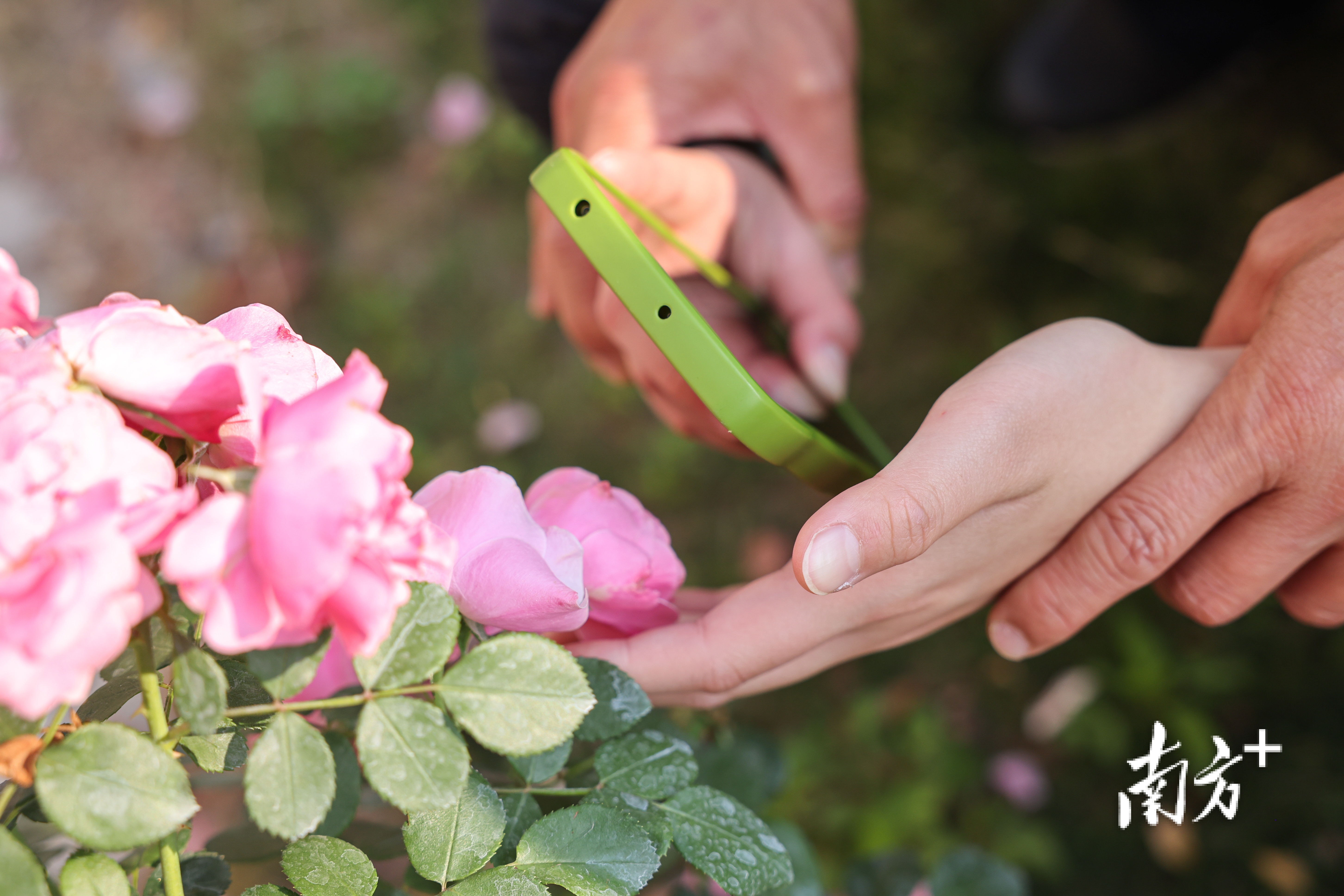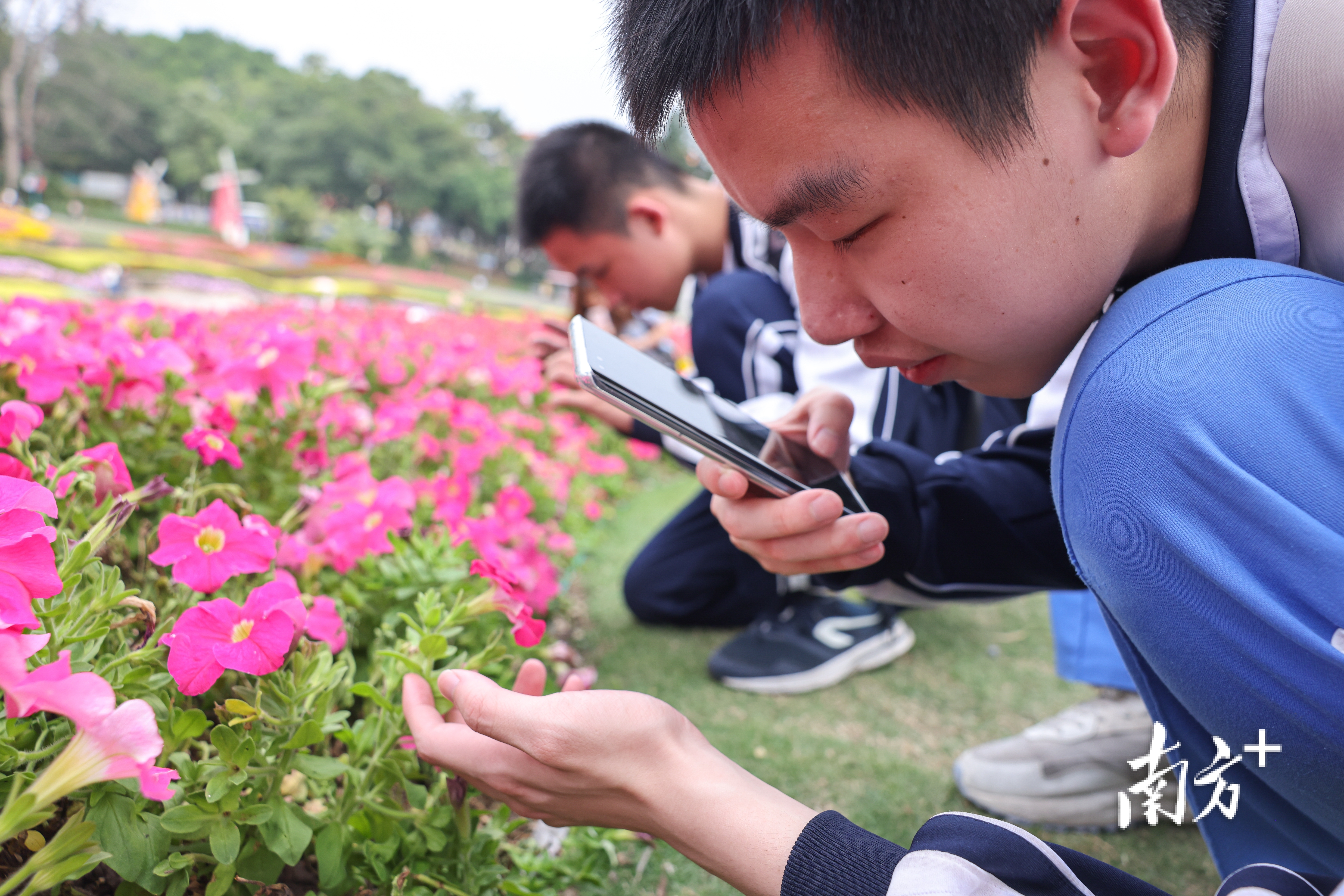 2025年4月9日,广州,视障学生方健坤近距离拍摄花朵。