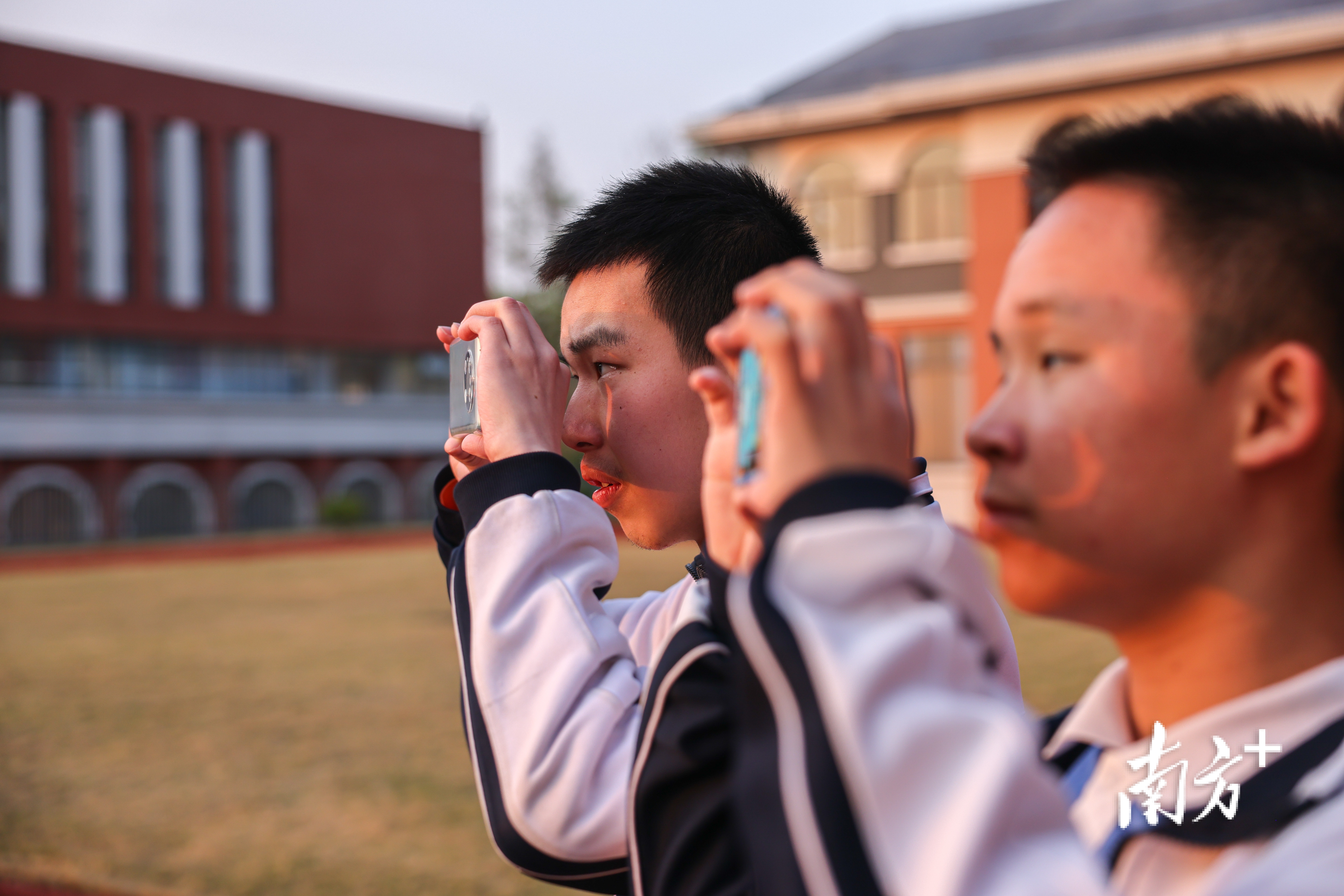 2025年4月1日,广州市启明学校,方健坤和江健来到操场拍摄晚霞。