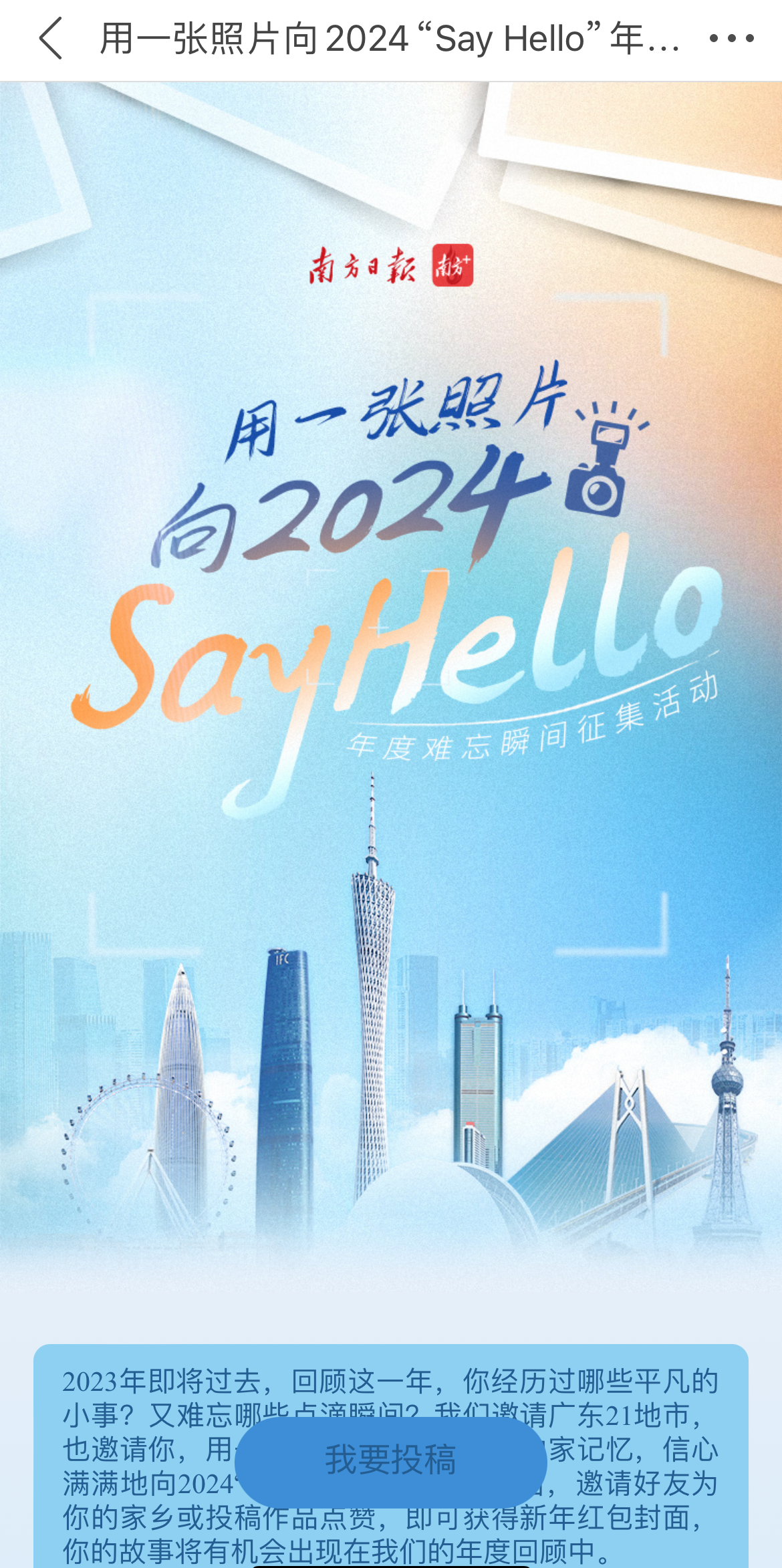 2023年即将过去,回顾这一年,你经历过哪些平凡的小事?又难忘哪些点滴瞬间?翻一翻相册,温暖的、感动的、喜悦的、自豪的,那些生活中不经意的瞬间和时刻,总有一段具体而微、真实可感的故事。我们邀请广东21地市,也邀请你,用一张照片,重温2023的独家记忆,信心满满地向2024“Say Hello”。