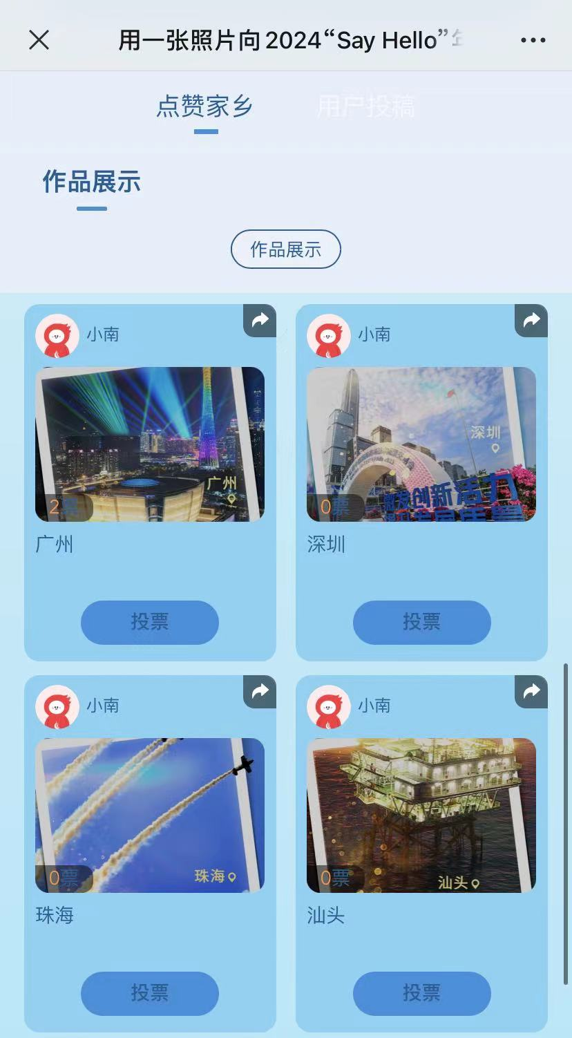👉第二步:个人投稿作品审核通过后将在“用户投稿”页面进行展示,届时欢迎邀请好友为你助力;同时,也可在“点赞家乡”页面,为广东21地市点赞。活动期间,每个微信用户每天可投10票,每个南方+客户端用户每天可投10票。