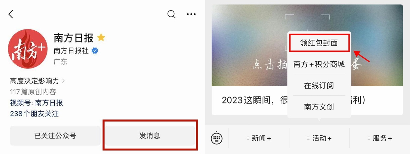 👉第三步:点击“发消息”,在下方菜单栏中点击“活动+”标签,然后点击“领红包封面”标签,进入领取页面,定制红包封面等你拿!