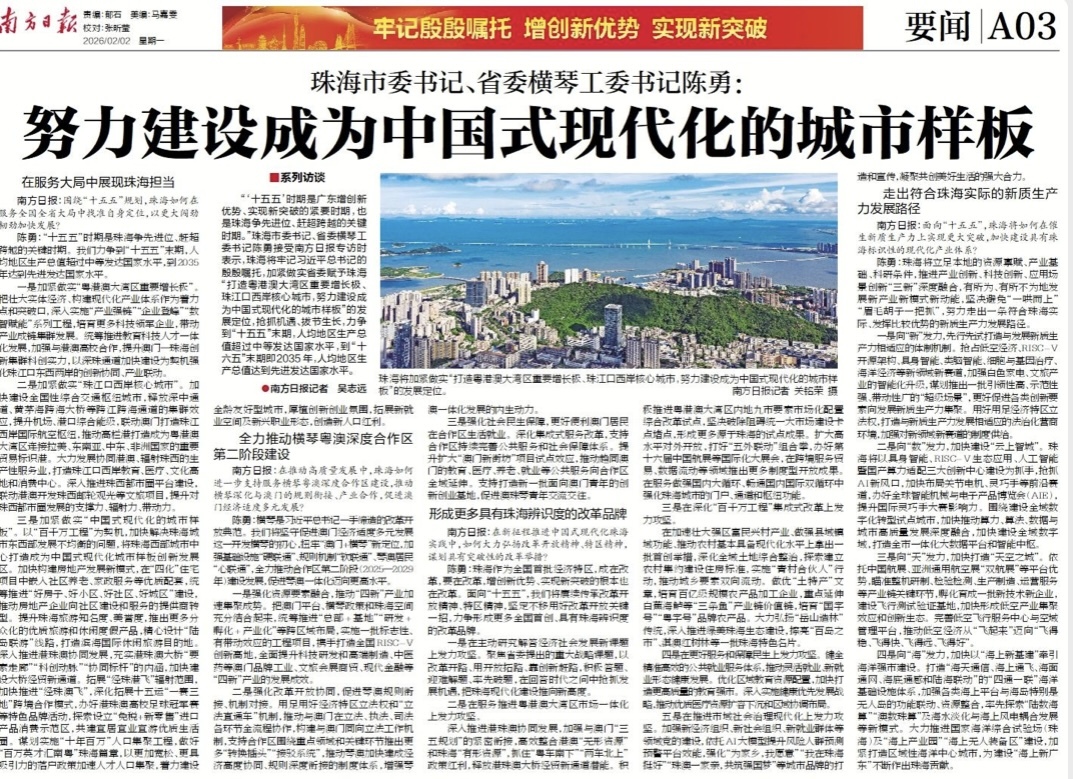 南方日报:面向“十五五”,珠海将如何在催生新质生产力上实现更大突破,加快建设具有珠海标识性的现代化产业体系?