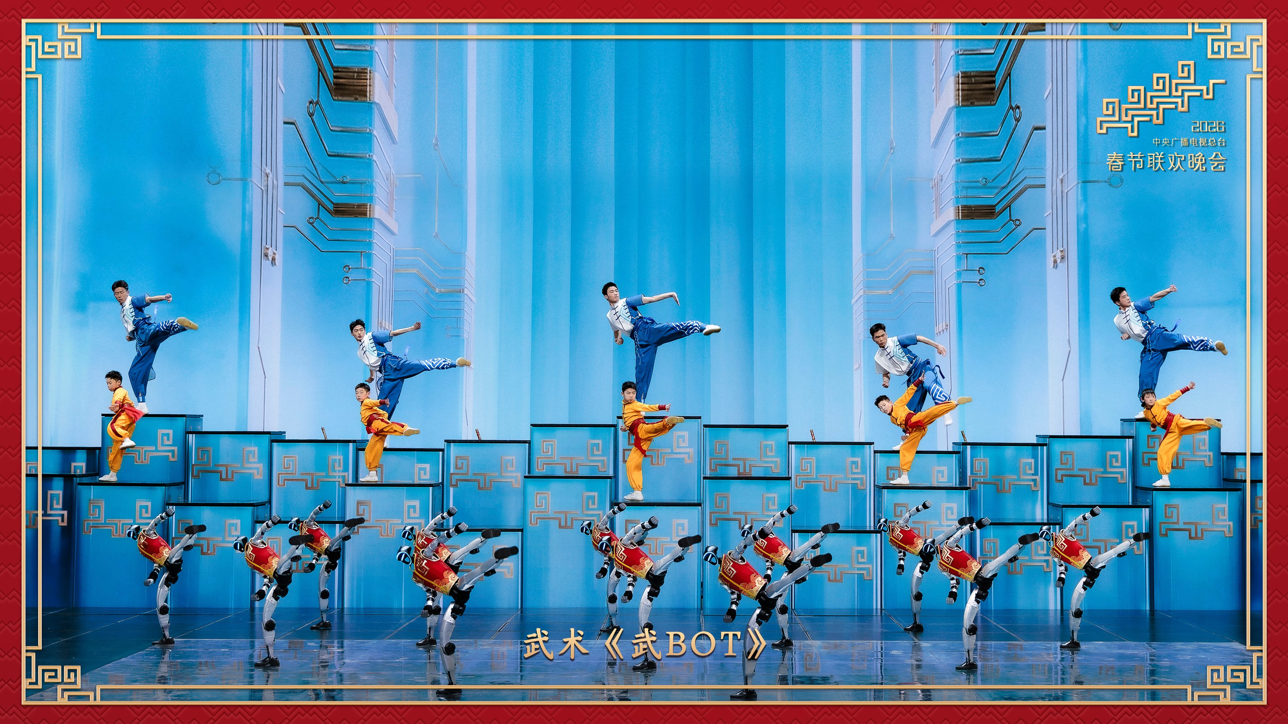 蔡明带着小品《奶奶的最爱》回归,与她搭档的除了演员王天放,还有具身机器人、仿生机器人。小品中的机器人会撒娇、讲笑话,情绪价值拉满;还会变魔术、后空翻,技能值爆表。武术《武BOT》由宇树科技与河南塔沟武校联袂呈现,数十台机器人扎马步、扫堂腿、侧空翻一气呵成,与功夫小子们配合耍棍、醉拳,行云流水。这一幕“功夫+科技”的硬核浪漫迅速刷屏,诠释了中华武魂。