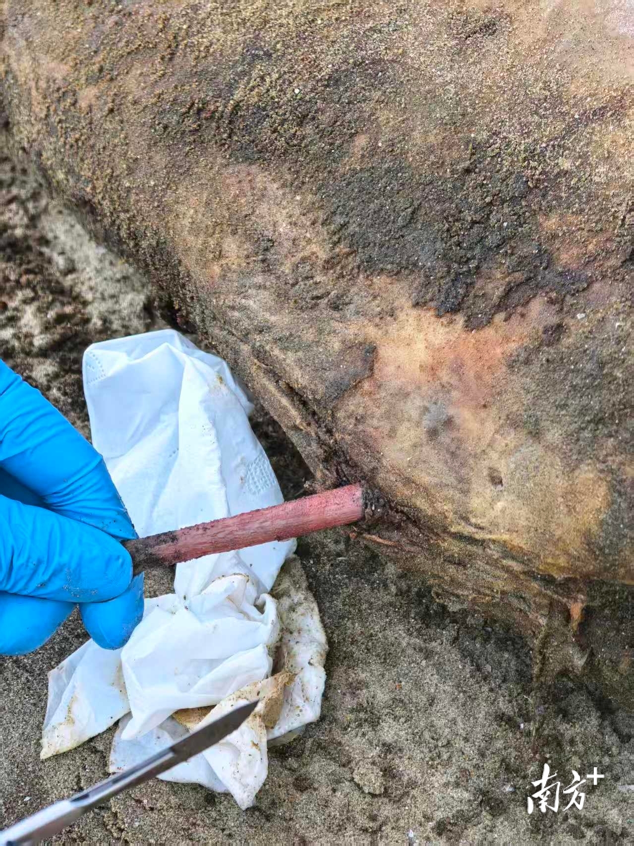 接到报告后,湛江市海洋与渔业局迅速响应,立即联系并协调中国科学院深海科学与工程研究所海洋哺乳动物研究团队的专家赶赴现场。当晚,研究人员即对尸体开展鉴定和采样工作。