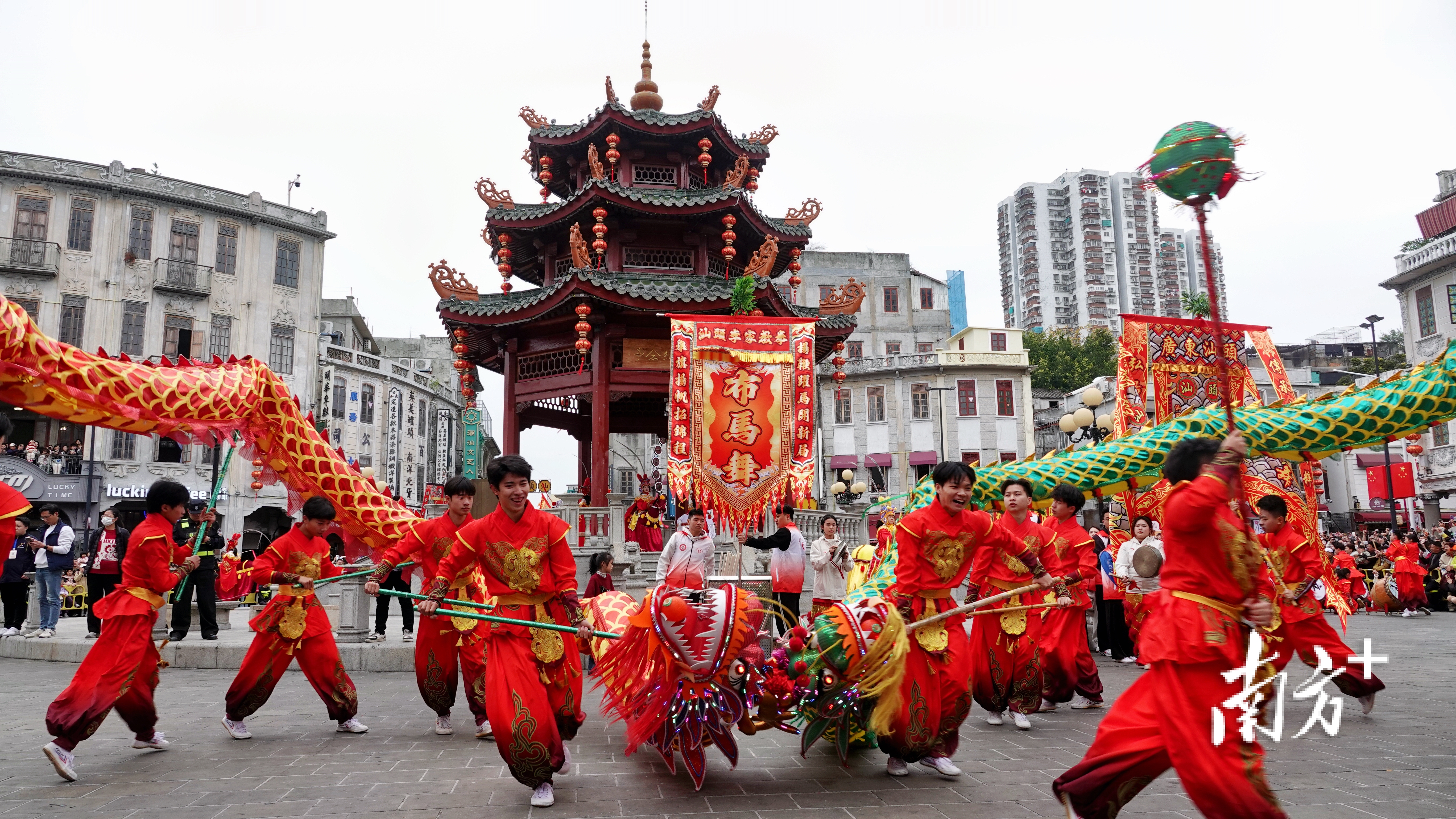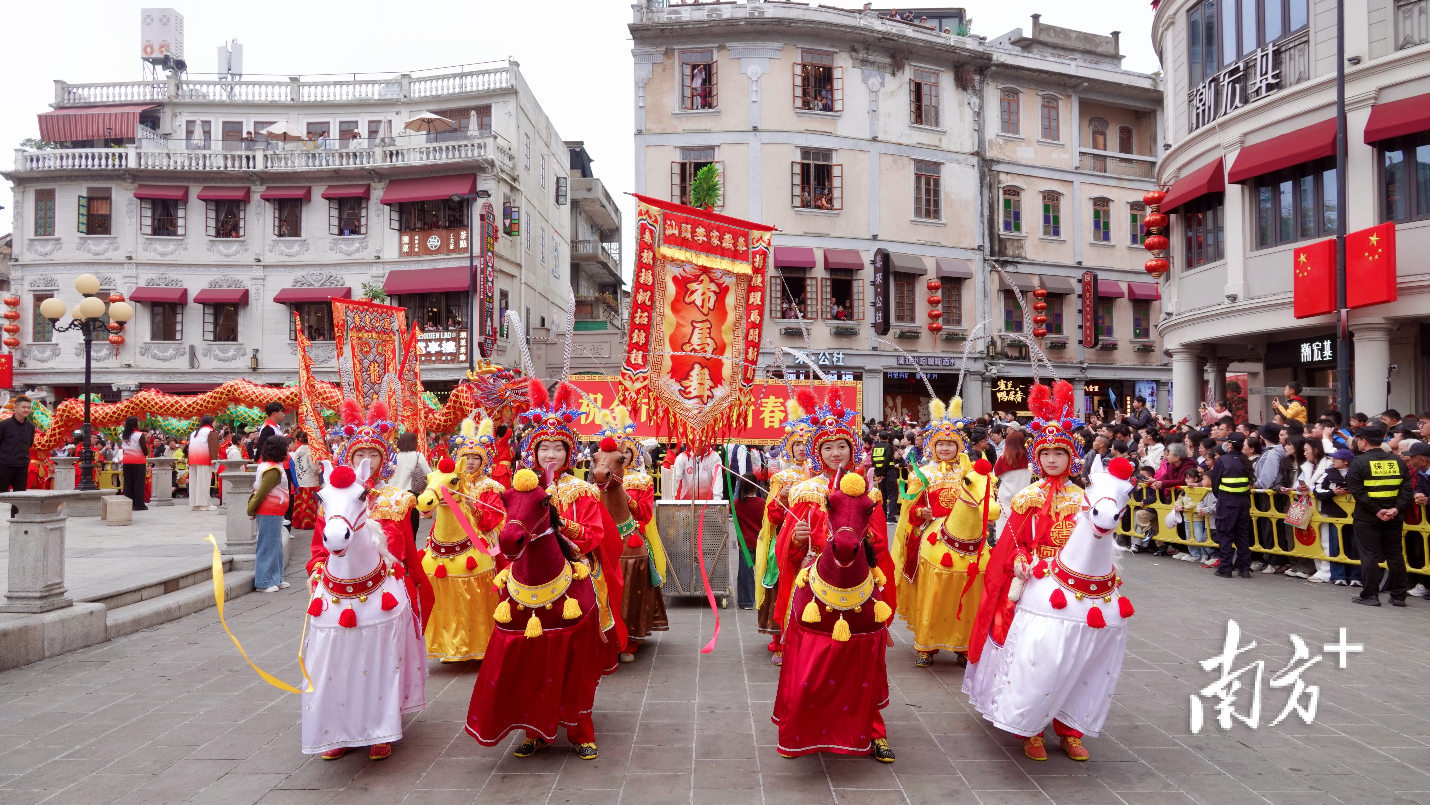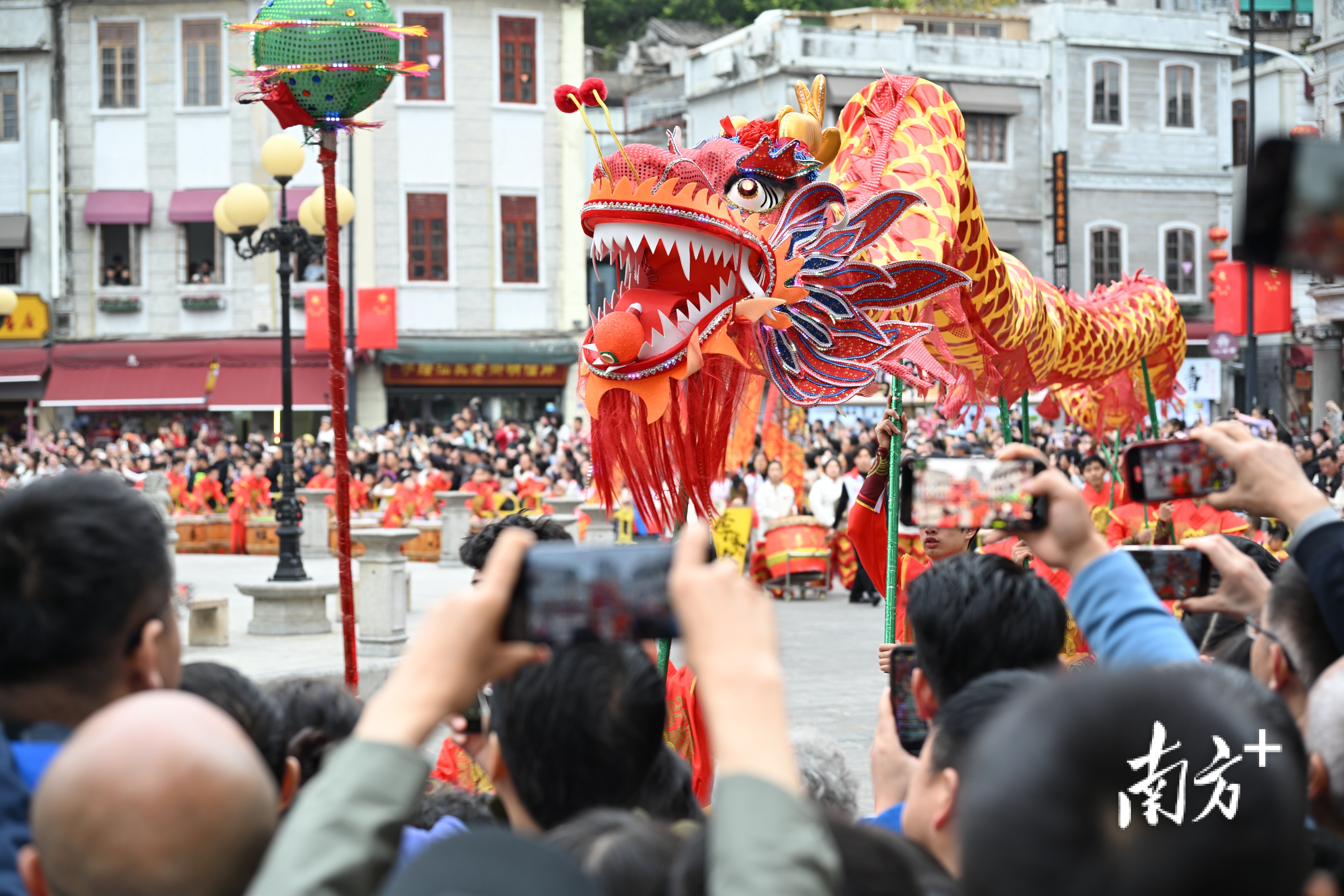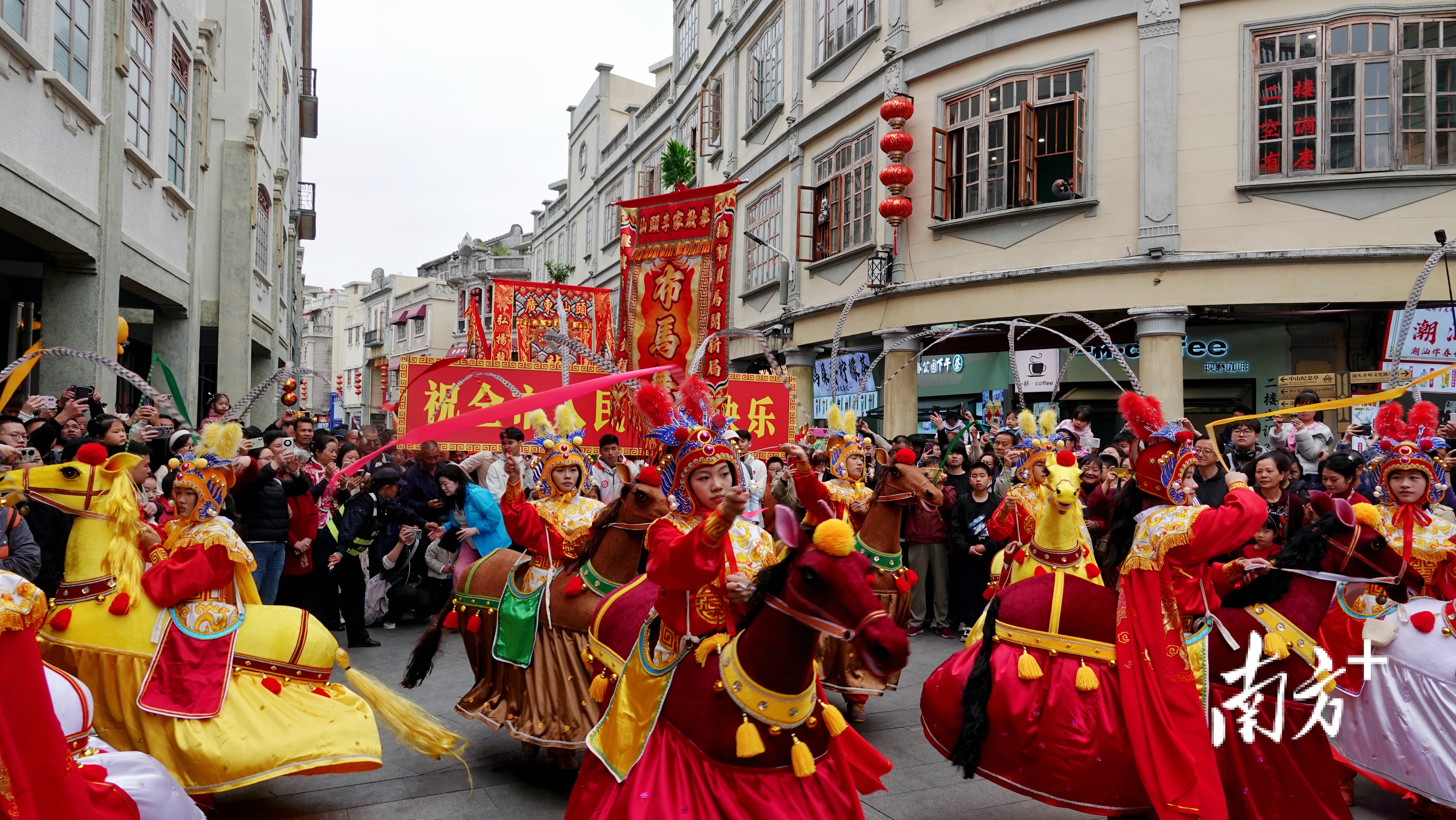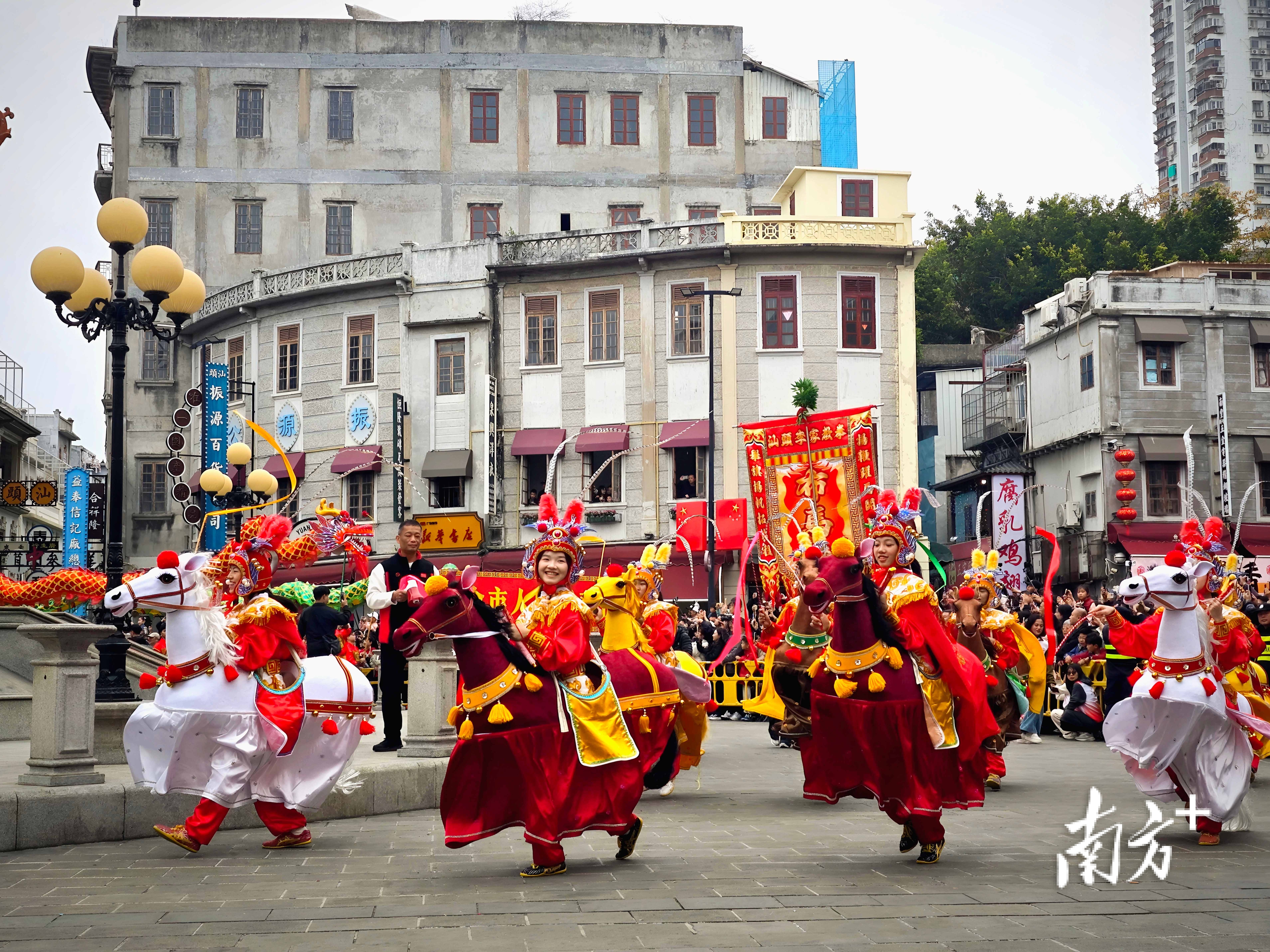 张灯结彩的骑楼下,年味有了具体的画面:二十四节令鼓的雷霆之音叩响天地,布马舞的灵动身姿踏响吉祥,舞龙醒狮的磅礴气势腾跃苍穹;龙马舞踏歌而来,骏马奔腾的姿态藏着马年顺遂的美好祝愿。