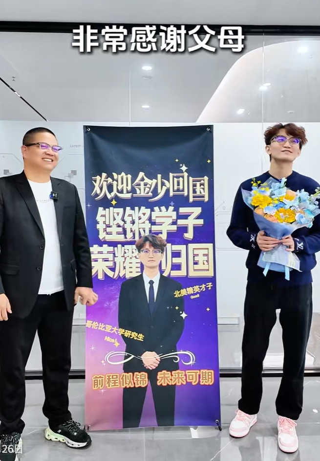 2025年12月,鸿铭股份董事长金健(左)发布视频,欢迎儿子金玺学成归国。