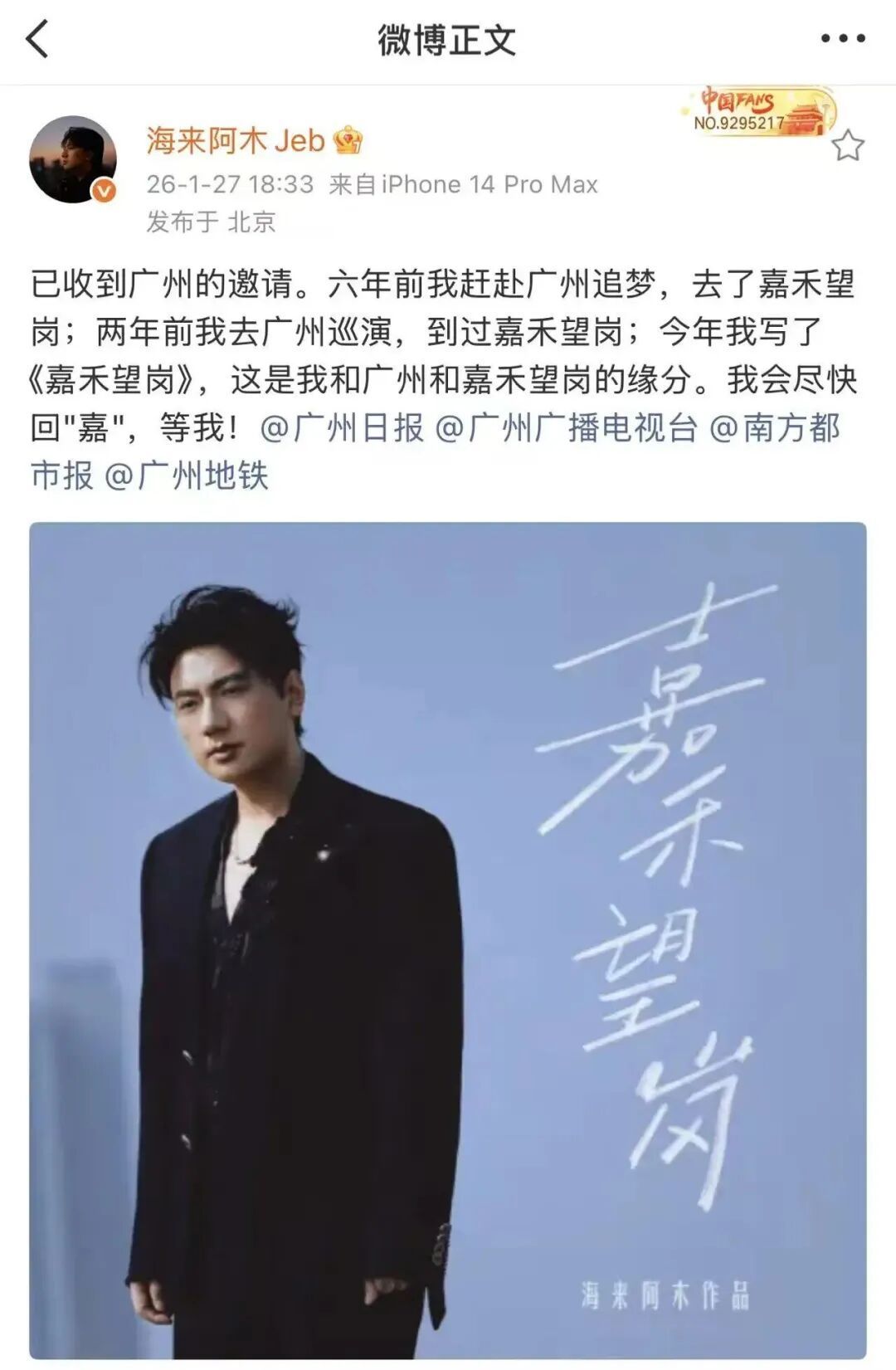 广州白云区向歌手发出“春日不迟 欢迎回‘嘉’”的邀请后,海来阿木最新回应:“我会尽快回‘嘉’!”