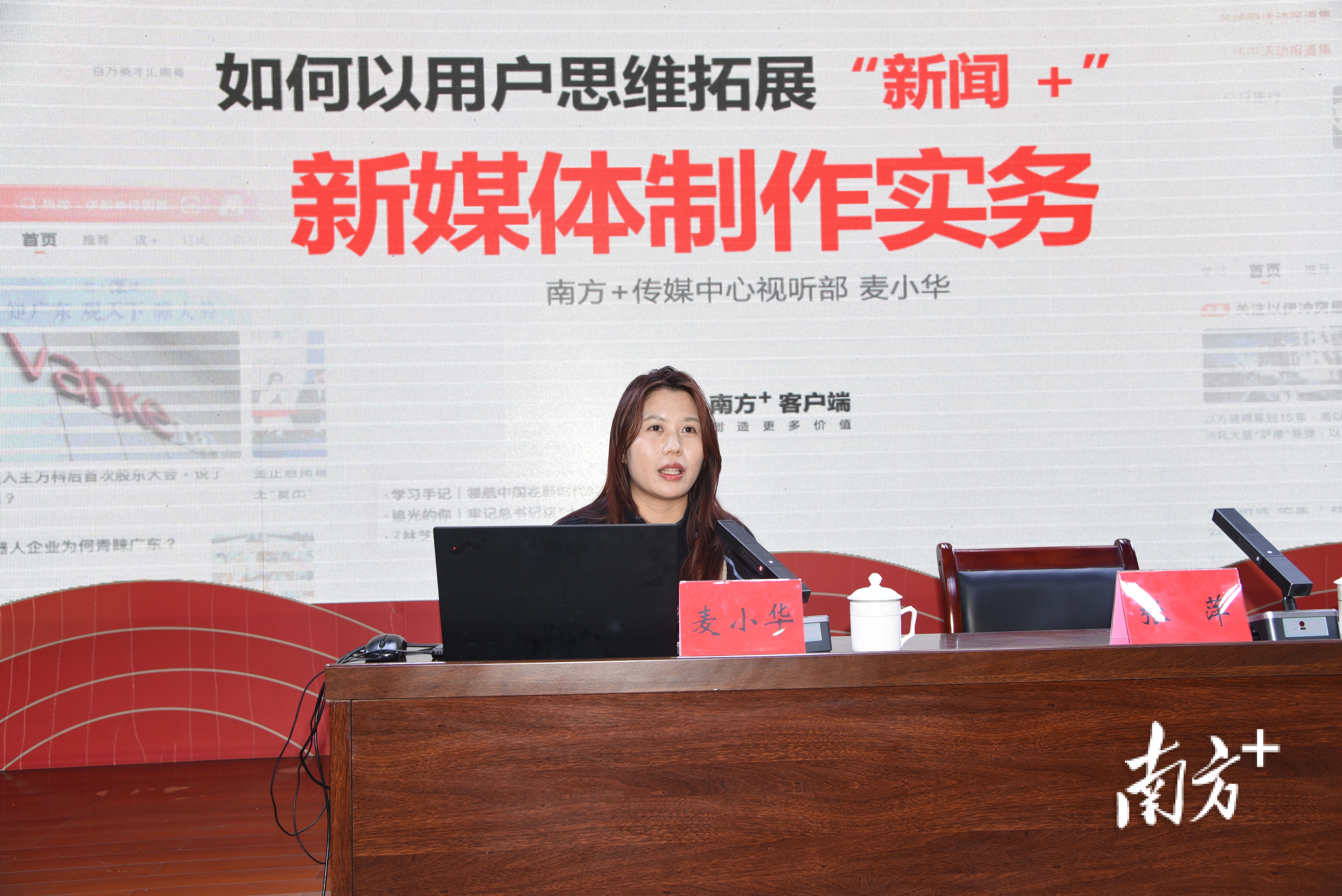 南方+传媒中心资深新媒体编辑麦小华则结合“九三”阅兵、鹅产业、医疗健康等方面的具体新媒体“爆款”案例,以《如何以用户思维拓展‘新闻+’:新媒体制作实务》为主题,分享了大活动大主题如何做好策划、如何做出有趣好玩的短视频、新媒体时代如何捕捉热点、AI如何赋能日常新闻采编等方面的业务知识,令在场人员直呼“有启发”。